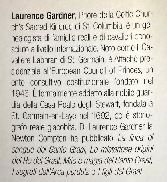 Laurence Gardner (1943-2010). Membro della Società degli Antiquari della Scozia, è stato uno storico del diritto, autore di libri per le autorità governative britanniche, russe e canadesi. Ha ricoperto la carica di priore della Sacred Kindred di St. Columba, e dei Cavalieri Templari di St Anthony. È stato un genealogista di famiglie reali e di cavalieri di fama internazionale e Storiografo Reale Giacobita. Di Laurence Gardner la Newton Compton ha pubblicato La linea di sangue del Santo Graal, I segreti dell’arca perduta, I figli del Graal, L’enigma del Graal e I segreti della massoneria.