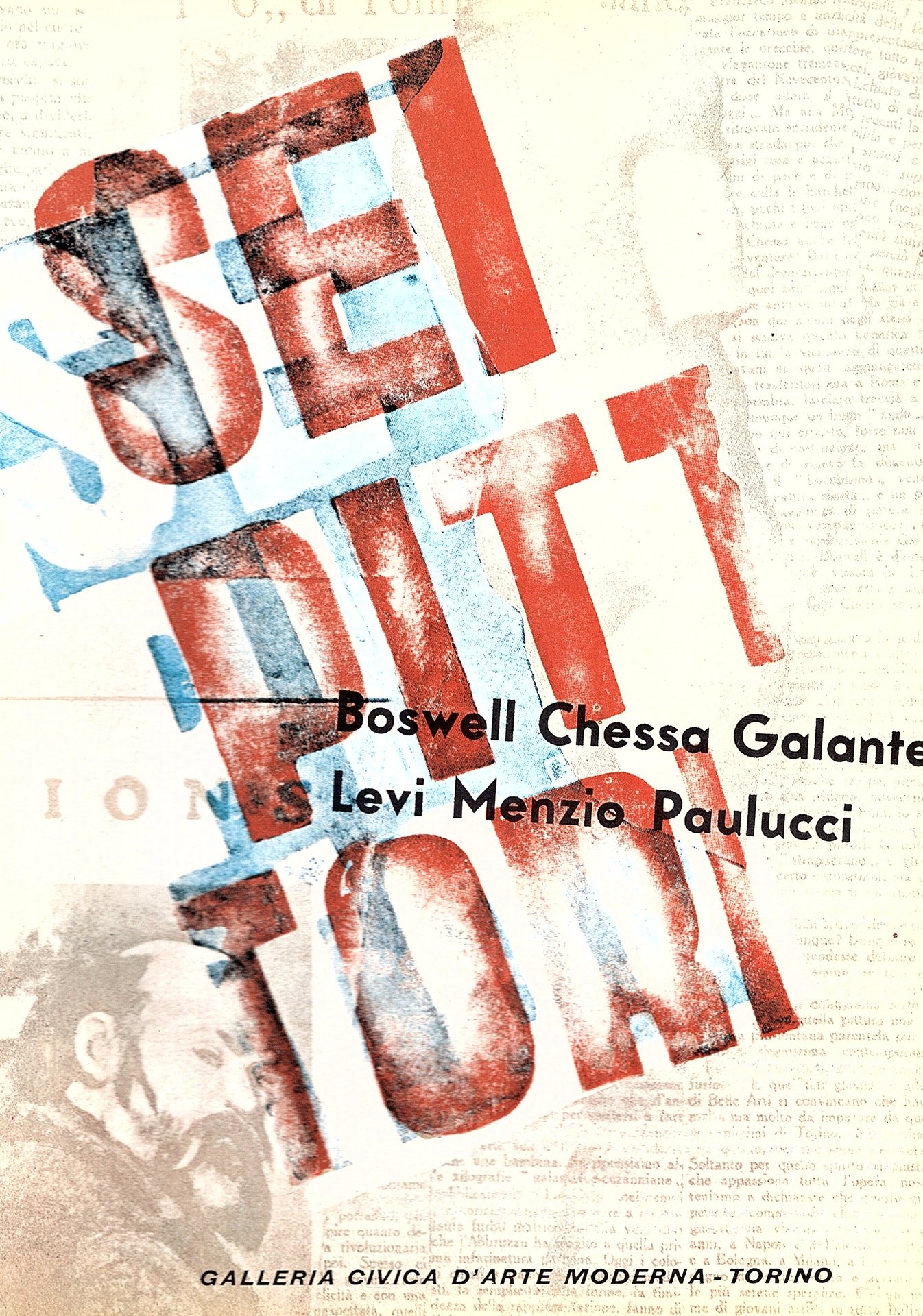 In-8°, pp. 30, brossura editoriale illustrata con il titolo a due colori sovrapposto a dipinti e a fogli di giornale sullo sfondo in modo da ottenere un effetto collage. 189 tavv. b.n. f.t. Con testi di Giulio Carlo Argan, Carlo Levi, Enrico Paulucci. Catalogo di celebre esposizione tenutasi alla Galleria d'Arte Moderna di Torino nel 1965 di opere dei Sei di Torino (Boswell, Chessa, Galante, Levi, Menzio, Paulucci).