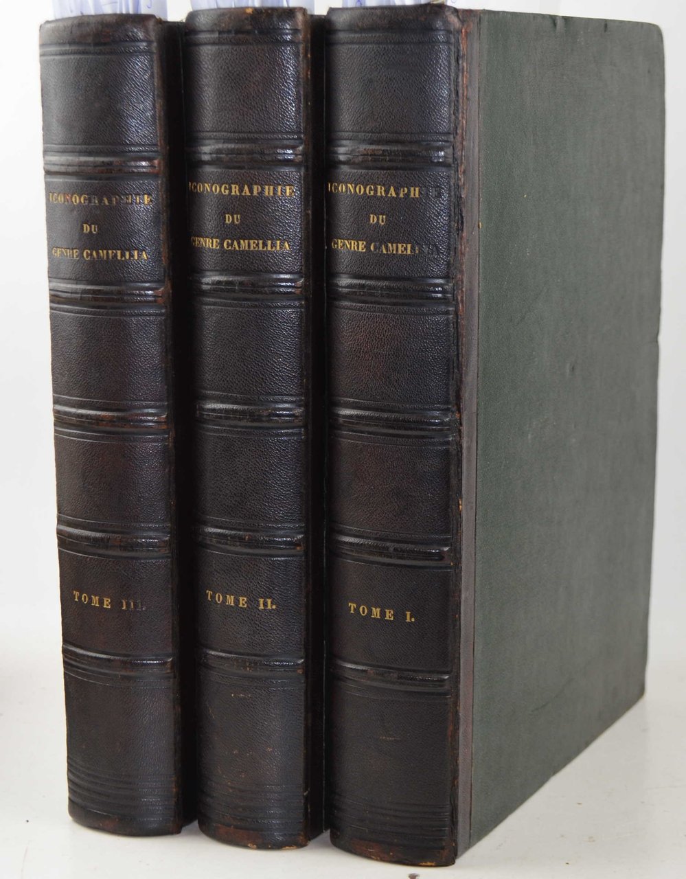 Tre volumi di cm. 35. Con frontespizi, indici e carte di dedica seguiti da 300 tavole finemente incise in rame e in coloritura coeva, ciascuna accompagnata da una carta di testo esplicativo. Le tavole risultano disegnate da J.J. Jung, incise da Dumenil, Gabriel e Oudet e stampate da N. Remond. Legatura coeva in mezza pelle, dorsi a nervi con titoli in oro. Manca una carta di dedica al terzo volume, altrimenti assolutamente completo in tutte le sue parti e soprattutto nel vastissimo apparato iconografico. Esemplare lavato, ma che mantiene intatto il vigore della parte incisa e della sua coloritura, con qualche fioritura sparsa e bruniture ad un terzo delle tavole; in maniera più evidente a 20 di esse. Peraltro esemplare complessivamente ben conservato. Si tratta senza dubbio della più importante raccolta iconografica dedicata al "Genere Camellia" ed è opera dell'abate trevigiano Lorenzo Berlese padre della cameliografia europea nato a Campomolino di Gaiarine (TV) nel 1784. Quest'ultimo aveva già pubblicato un lavoro monografico sulla camelia nel 1837 (Monographie du Genre Camellia) ma il presente e il suo contributo maggiore e definitivo. Fu tra l'altro vice presidente della Société Royale d'Horticulture di Parigi, città dove visse per oltre 40 anni e dove si dedicò alle sue serre.