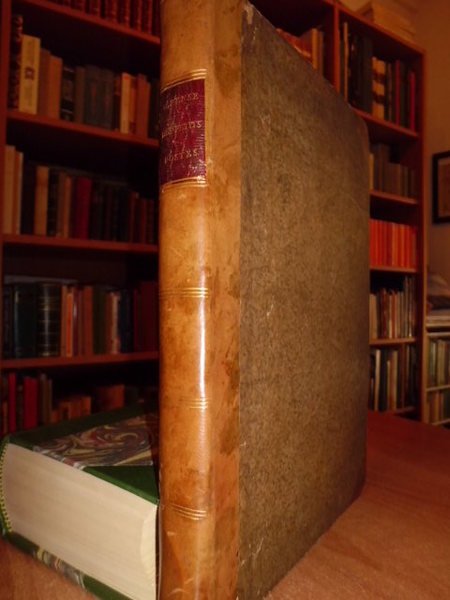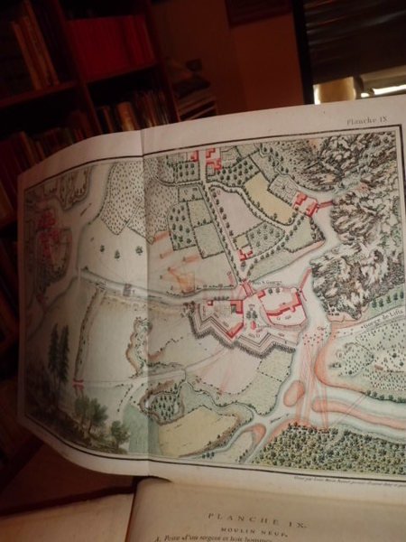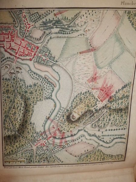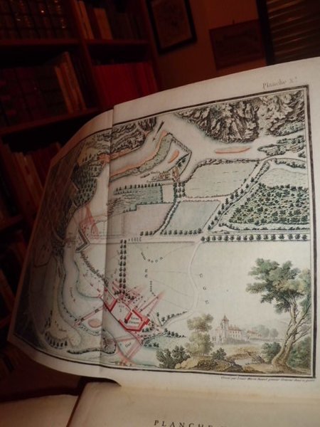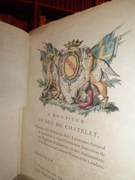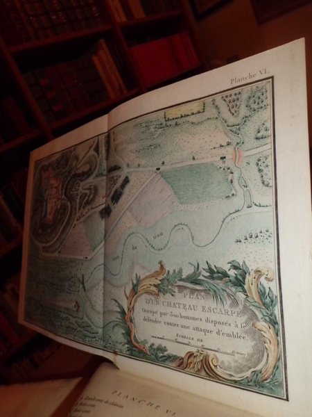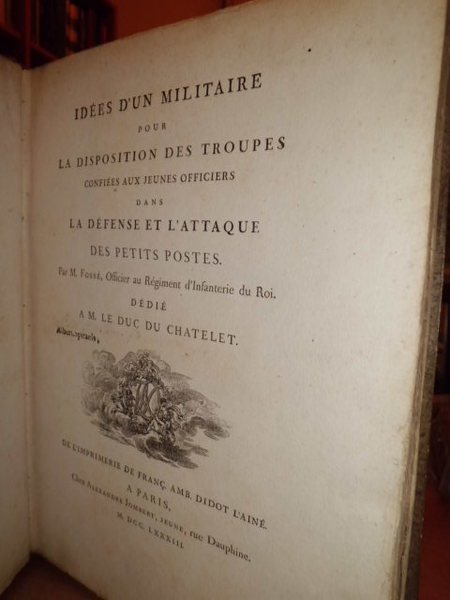 Idées d' un Militaire pour La Disposition des Troupes confiées aux jeuneis officiers dans petits postes. Précis pour servir a représenter Les Plans Militaires. Par M. Fossé, Officier au Régiment d' Infanterie du Roi. Dédié A. M. le Duc du Chatelet. Paris, De l' Imprimerie de Franç. Amb. Didot l' Ainé. Chez Alexandre Jombert, 1783. In - 4° grande, m. pelle coeva con angoli, titolo e fregi in oro sul dorso. 1 f. bianco, 1 f. col titolo, 1 f. titolo con frontespizio e marca tipografica incisa, 3 ff. con bello stemma inciso e colorato, 116, 60 pp., e 11 tavole dépliantes en couleurs avec explication pour chaque planche. Edizione originale molto rara, sconosciuta a Cohen - Ricci. Le illustrazioni sono di notevole interesse, in quanto sono incise in rame a colori, e sono tra le prime del genere. Le incisioni sono di Louis Marin. Ouvrage inconnu à Cohen et d' un très grand intéret quant à l' illustration des livres à gravures imprimés en couleurs - procédé qui n' a été employé courammen qu' une dizaine d' années après la parution de cet ouvrage. Le livre contien un "Précis des couleurs propores au lavis des plans et de la conduite à tenir les employer". Il est illustré d' une belle vignette d' armoiries et de 11 plans - veus ornés de ravissantes vignettes (le tout imprimé en couleur) par Louis Marin - Bonnet, premier graveur dans ce genre. De tou e rareté, notre exemplaire contien la dédicace au Duc du Chatelet avec les armoires en couleurs qui n'a figuré que dans quelques exemplaires. Brunet. II, 1354 (sans description). Quérard, La France littéraire, III, p. 173: Ouvrage estimé. Graesse, II, p. 620: .Ouvrage estimé. Le Blanc, Manuel de l' amateur d' estampes, I, p. 457.