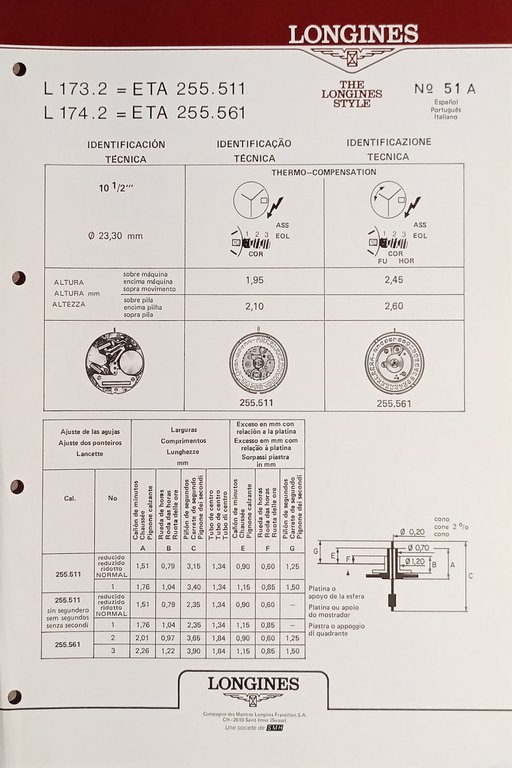 Identificazione Tecnica Longines N. 51 A - L 173.2 = ETA 255.511 - ed. 1987