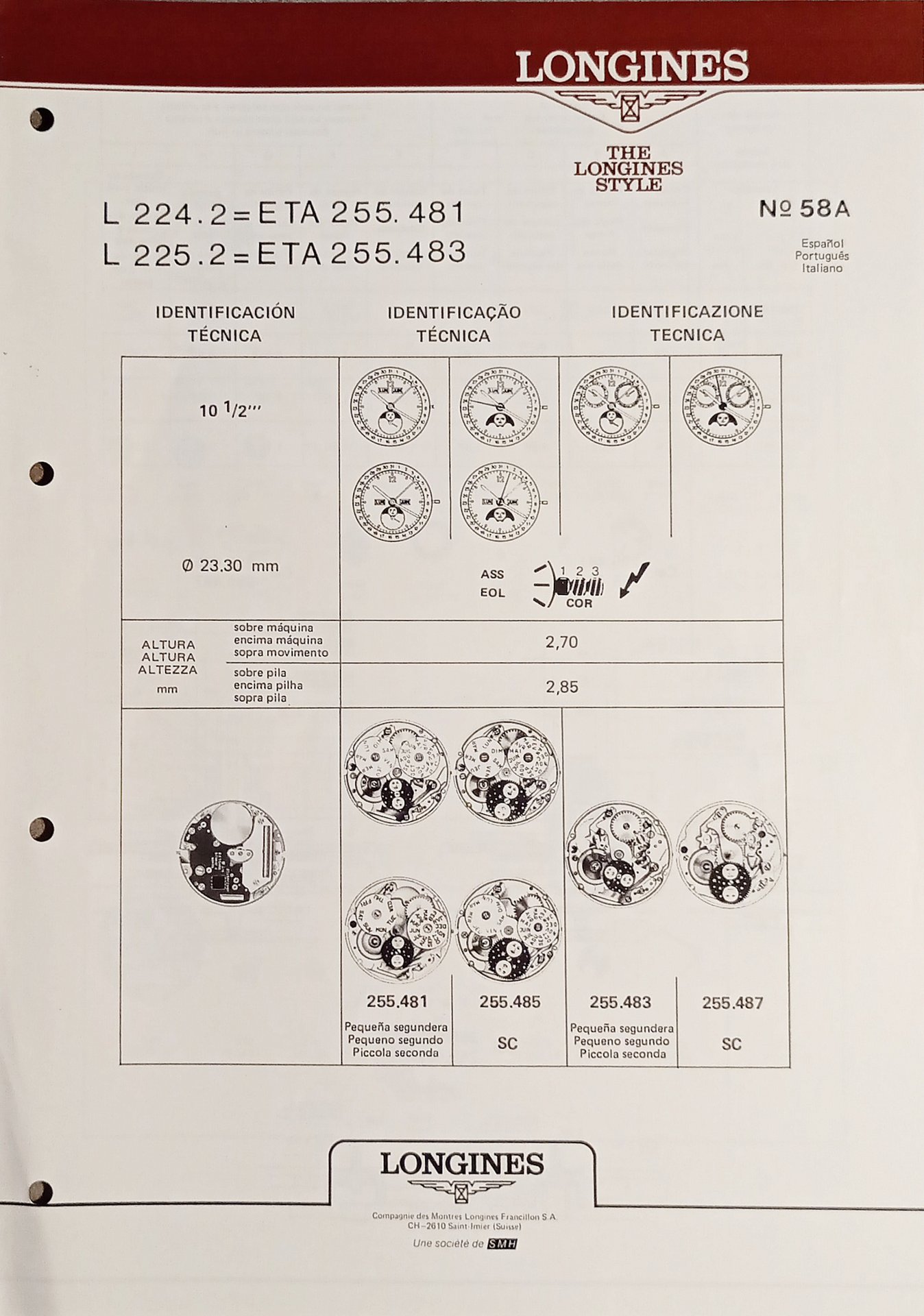 Identificazione Tecnica Longines N. 58 A - L 224.2 = ETA 255.481 - ed. 1988