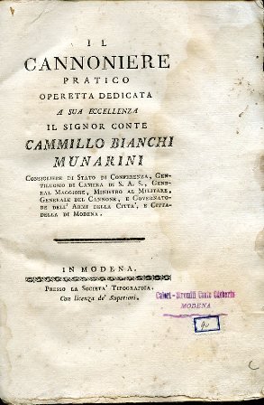 Il cannoniere pratico, operetta dedicata a sua eccellenza il signor conte Cammillo Bianchi Munarini, consigliere di Stato di Conferenza, gentiluomo di camera si S. A. S., generale maggiore, ministro al militare, generale del cannone, e Governatore.