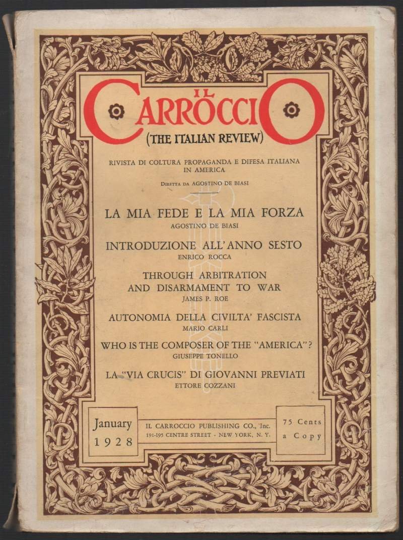 In 8, pp. XXXII-160-32. Br. ed. Cop. ill. a col. Numerose ill. b/n n.t. e f.t. Strappetti ai tagli del dorso della cop. Pagine leggermente ingiallite. Buon es. Il Carroccio. The Italian Review. Rivista di cultura, propaganda e difesa italiana in America. Diretta da Agostino De Biasi. Vol. XXVII N. 1 Gennaio 1928Luogo di pubblicazione New YorkEditore Il Carroccio Publishing Co., IncAnno pubblicazione 1928Materia/Argomento Riviste, Cultura italiana, Societbr> ***Due to bureaucratic reasons, books dated over 70 years old cannot be immediately exported, please contact us before placing the order.***