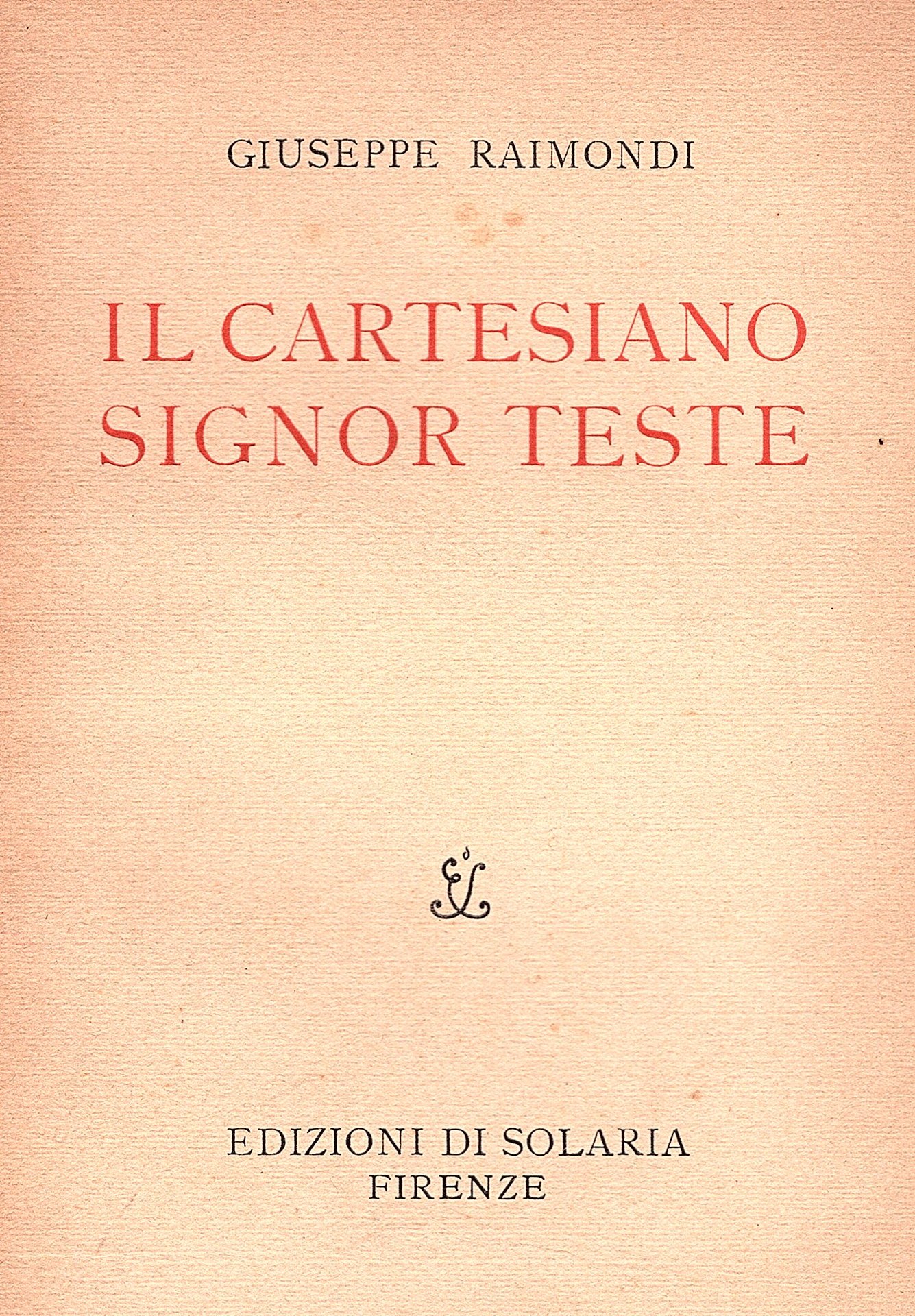 In-8°, pp. 63, (9), brossura editoriale con titoli in nero e rosso al dorso e al piatto anteriore con fregio tipografico di collana. Vignetta di Bruno Bramanti al frontespizio. Un disegno di Leo Longanesi in antiporta e un'illustrazione in b.n. n.t. Edizioni di Solaria - Quaderno settimo. Ottimo esemplare (n° 298/420) entro velina nella variante editoriale priva del disegno di Bramanti e con diversi caratteri richiesta dal'autore Prima edizione. Analisi del Monsieur Teste di Paul Valéry. Cfr. Gambetti - Vezzosi, p. 751. Spaducci, p. 243.