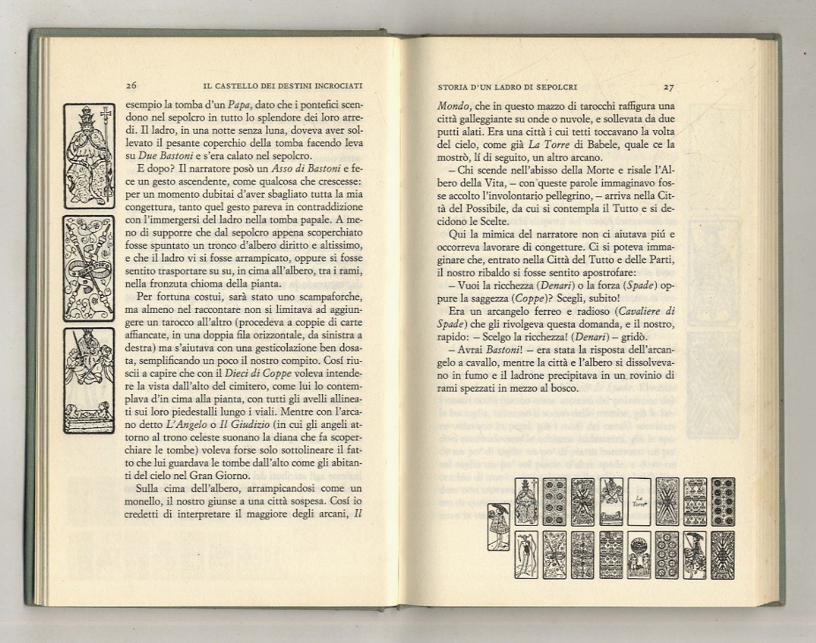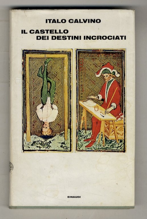 Torino, Einaudi, 1973, in-8, tela editoriale con sovraccoperta illustrata a colori (tarocchi di Bonifacio Bembo, Morgan Library), pp. [4], 128, [4]. Con illustrazioni in b.n. nel testo che riproducono carte dei tarocchi. Prima edizione parziale: nel 1969 era uscito per Franco Maria Ricci un volume dedicato ai tarocchi in edizione di lusso di 1000 esemplari, intitolato "Tarocchi. Il mazzo visconteo di Bergamo e New York"; in esso appariva il testo di Calvino "Il castello dei destini incrociati"; in questa successiva edizione il libro si amplia con un secondo racconto fantastico dal titolo "La taverna dei destini incrociati". Buone condizioni.