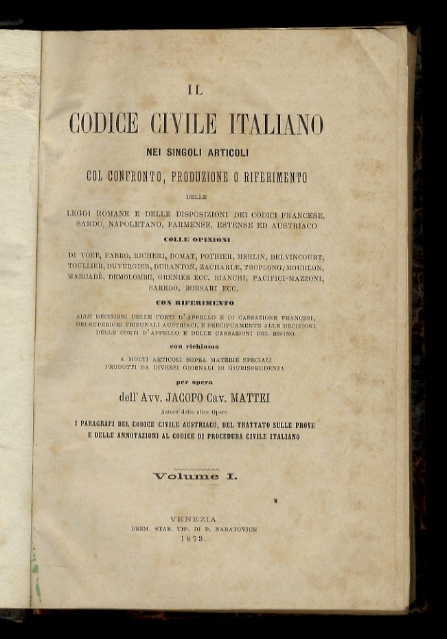 Il codice civile italiano nei singoli articoli col confronto, produzione o riferimento delle leggi romane e delle disposizioni dei codici Francese, Sardo, Napoletano, Parmense, Estense ed Austriaco colle opinioni di Voet, [.], Richeri, Domat, Pothier, [.] Toullier, [.] Troplong, [.] Demolombe, [.] Pacifici-Mazzoni, Saredo, Borsari ecc. [.]. | Libri antichi e moderni | Mattei Jacopo.