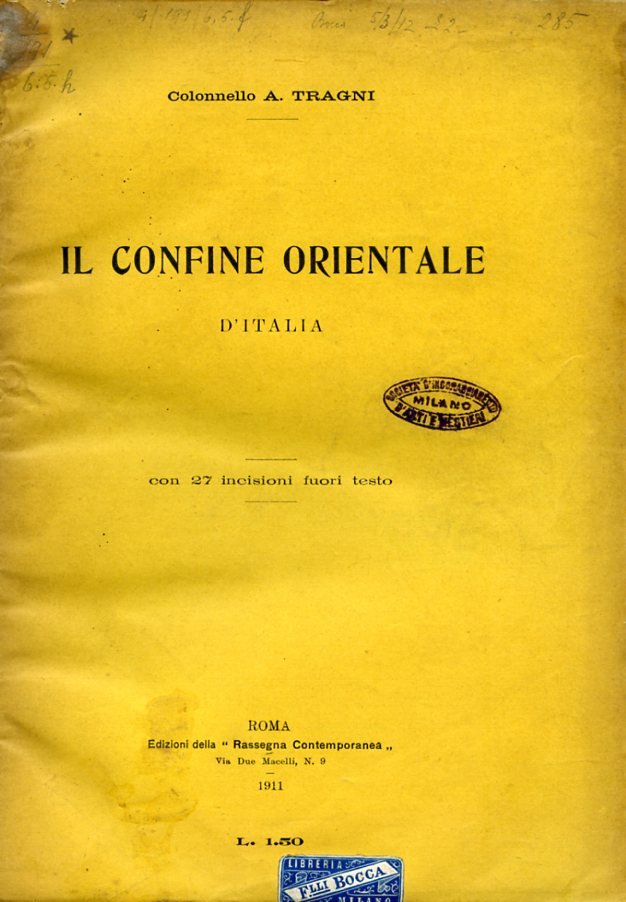 In 8, pp. 79, brossura editoriale. 12 tav. f. t. con 27 incisioni. Timbri di associazione ottocentesca. Pecetta del tempo della libreria Bocca di Milano. Bell'esemplare. Nel saggio, pochi anni prima dell'esplosione del primo conflitto mondiale, l'autore descrive e analizza i confini orientali italiani, specificamente sotto l'aspetto delle difese militari.