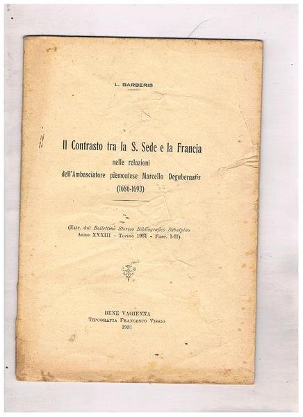 Il contrasto tra S. Sede e la Francia nelle relazioni dell'Ambasciatore piemontese Maercello Degubernatis (1686-1693). Estratto. | Libri antichi e moderni | Barberis L.