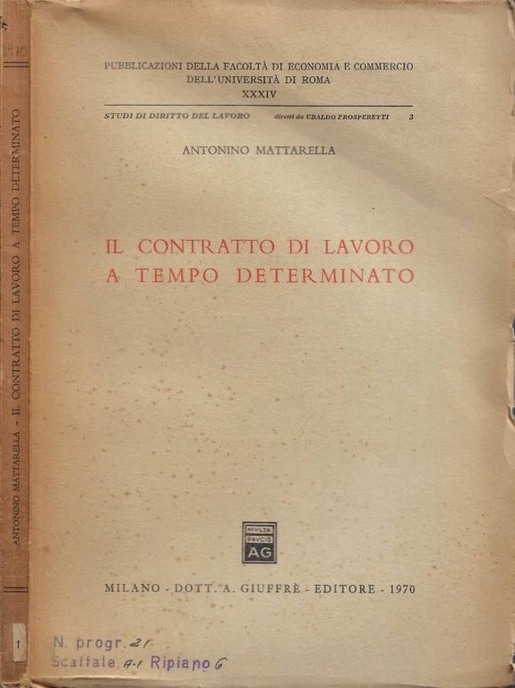 Coperta maggiormente imbrunita al dorso e con irregolarità da fattore tempo. Tagli imbruniti e leggermente irregolari, pagine ben salde alla costa e con imbrunitura. Volume completamente fruibile e parzialmente intonso, n. 34 della collana "Pubblicazioni della Facoltà di Economia e Commercio dell'Università di Roma - Studi di diritto del lavoro" diretta da Ubaldo Prosperetti, presenti note a piè di pagina, numero pagine 175; da segnalare: timbro al piatto anteriore