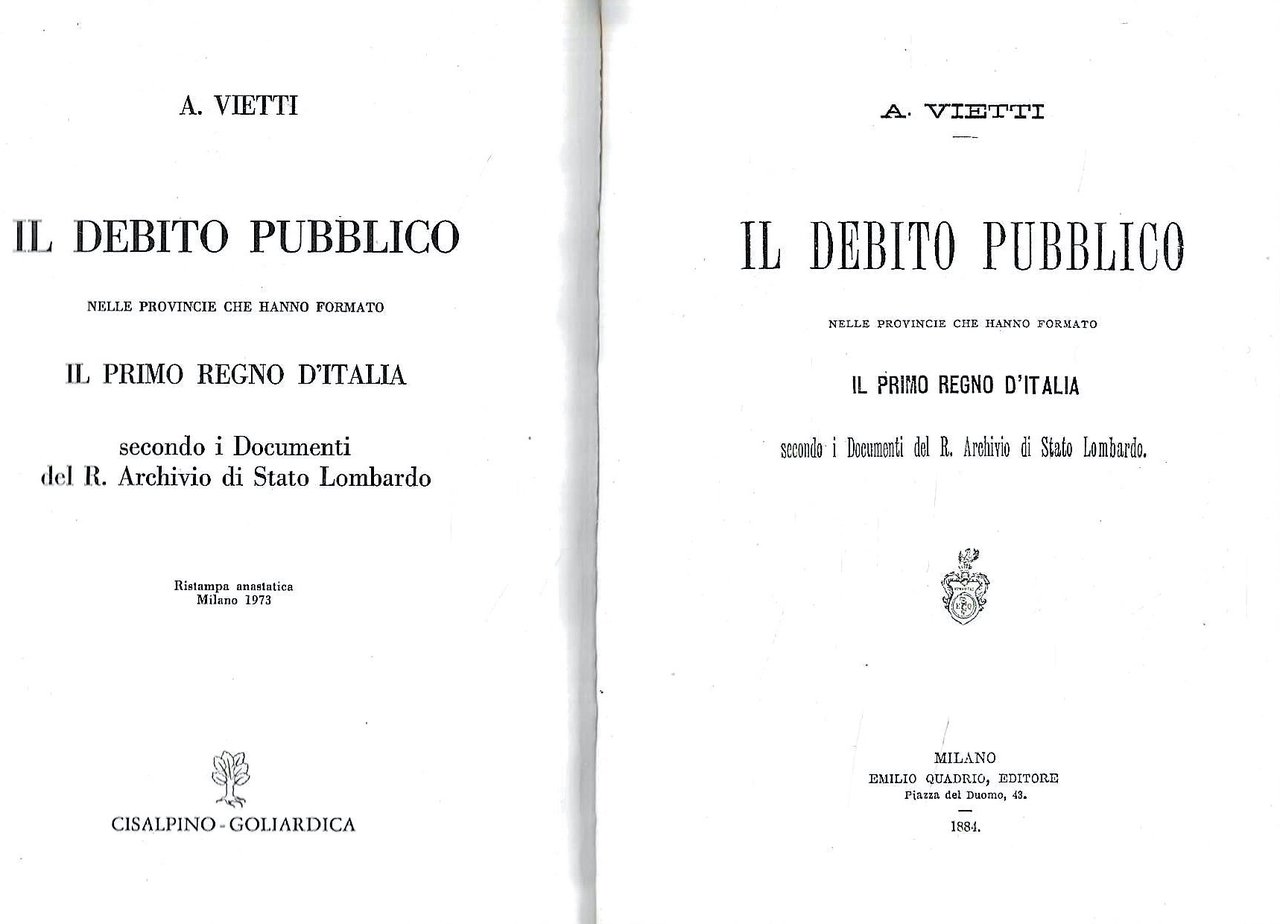 Il debito pubblico nelle provincie che hanno formato il primo Regno d'Italia secondo i documenti del R. Archivio di Stato Lombardo (Rist. anastatica) | Libri antichi e moderni | Vietti, A., ,Vietti, A.