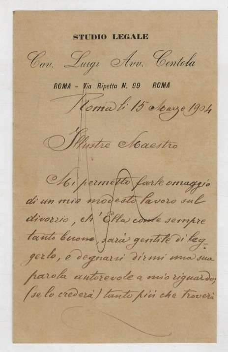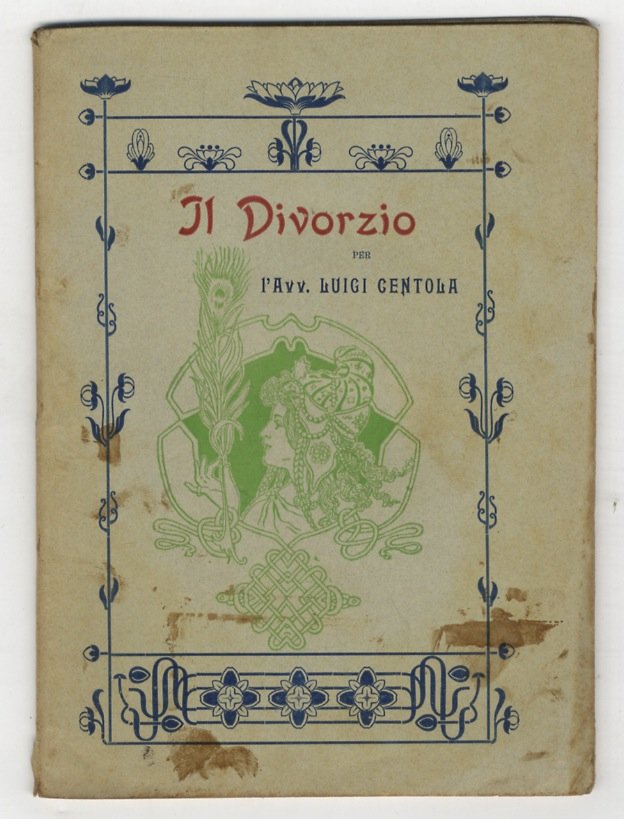 Bari, Tipografia Nazionale, 1903, in-8, brossura editoriale con fregio e graziosa cornice tipografica in stile Liberty, pp. 66. Raro opuscoletto di teoria giuridica e storia del divorzio. Con dedica autografa dell'autore al frontespizio e, allegata, una lettera, sempre dell'autore, su tre facciate indirizzata all'On. Prof. Enrico Pessina. Alcune macchie alle copertine, per il resto in buone condizioni.