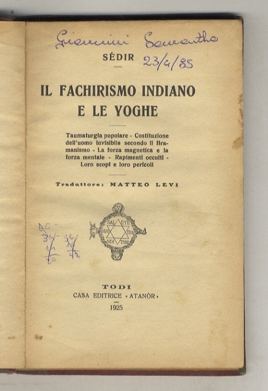 Il fachirismo indiano e le Yoghe. Taumaturgia popolare - Costituzione dell'uomo invisibile secondo il Bramanismo - La forza magnetica e la forza mentale - Rapimenti occulti - Loro scopi e loro pericoli. Traduttore: Matteo Levi. | Libri antichi e moderni | Sédir Paul (Yvon Le Loup).