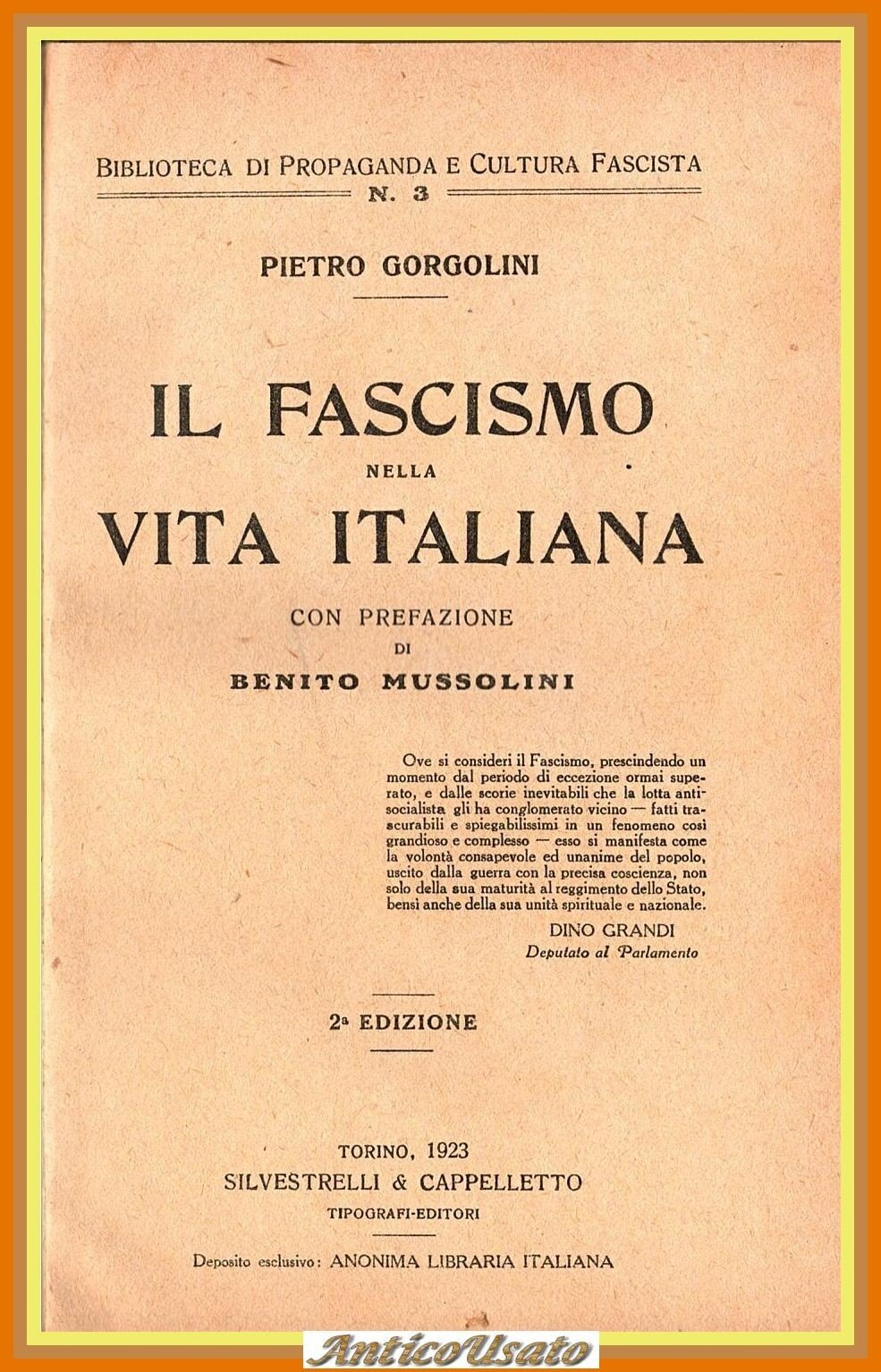 IL FASCISMO NELLA VITA ITALIANA di Pietro Gorgolini con prefazione di Benito Mussolini. Silvestrelli & Cappelletto Editore, 1923. 259 pagine. Copertina non editoriale in mezza tela. Stato di conservazione: molto buono (pagine normalmente ingiallite) Libro usato saggistica