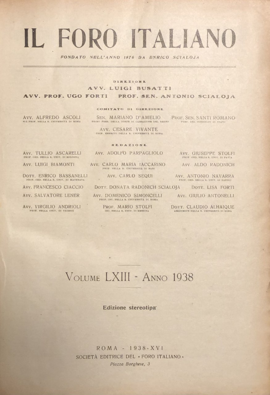 Il Foro Italiano. Fondato nell'anno 1876 da Enrico Scialoja. Anno LXIII. 1938