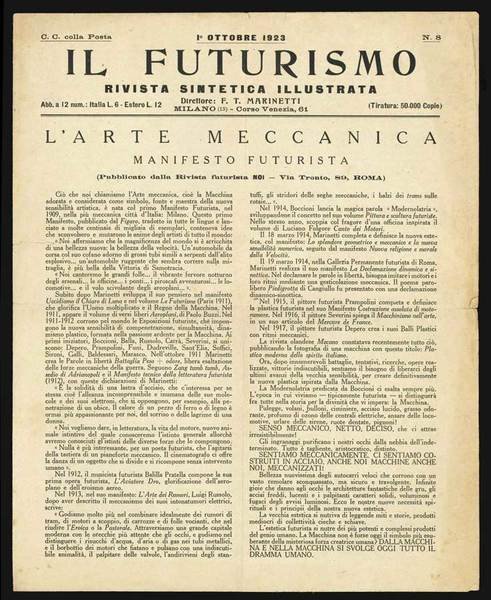 «Il Futurismo: Rivista sintetica illustrata n. 8: L’arte meccanica. Manifesto futurista (Pubblicato dalla Rivista futurista NOI — Via Tronto, 89, ROMA) [segue:] L’architettura futurista. Manifesto dell’11 luglio 1914.