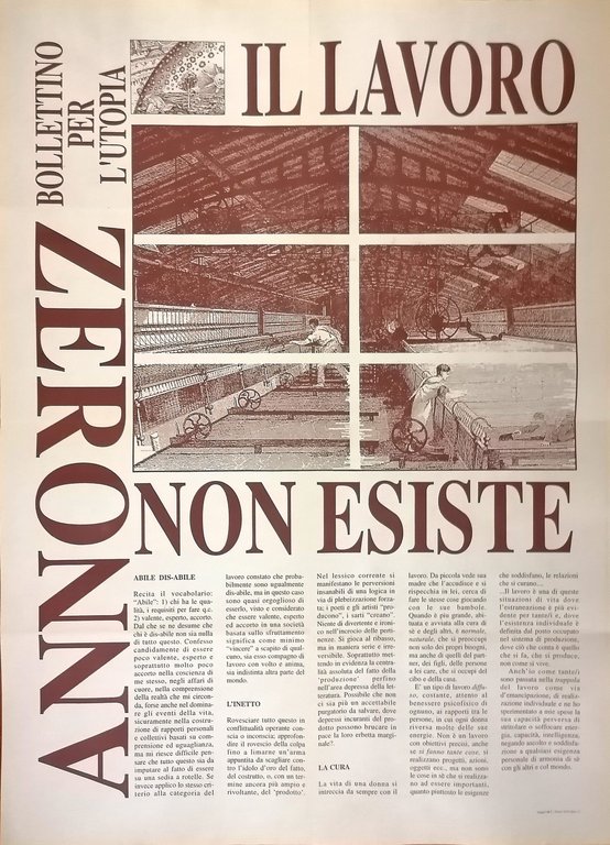 Il lavoro è una di queste situazioni di vita dove l'estraneazione è più evidente per tante/i e, dove l'esistenza individuale è definita dal posto occupato nel sistema di produzione, dove ciò che conta è quello che si fa, si produce, non come si vive. Foglio murale, in ottimo stato.