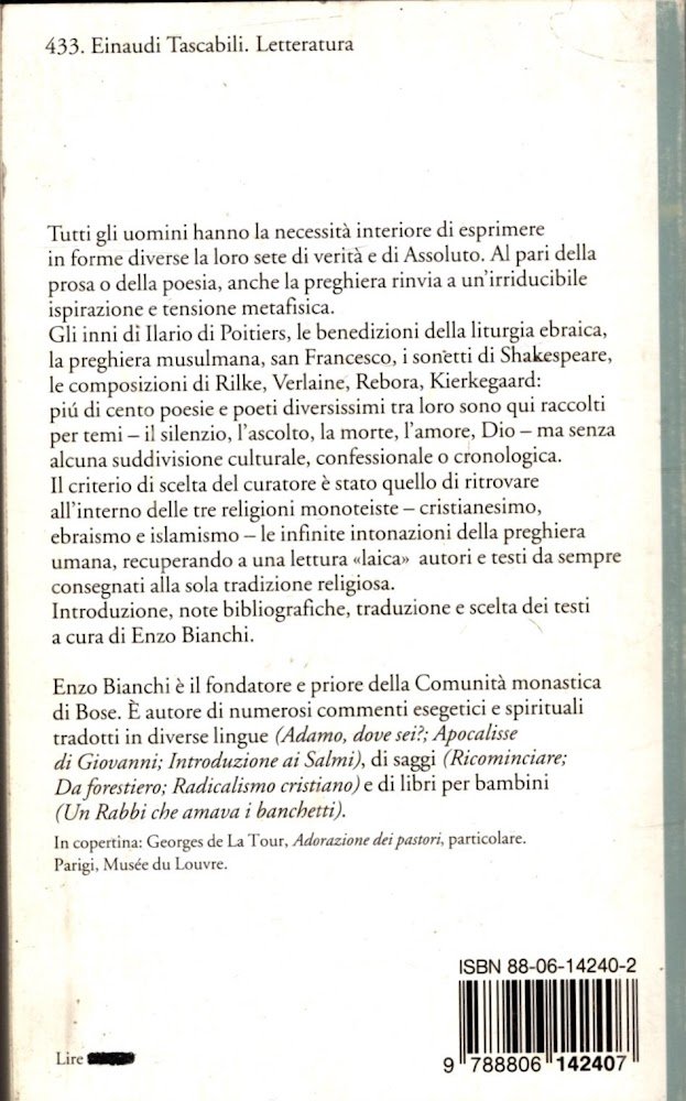 Superando i confini confessionali, il libro vuole seguire l'ispirazione di poeti diversisimi tra loro, e tuttavia accomunati da una tensione metafisica e spirituale irriducibile, anche quando si tratta di preghiere legate a occasioni o a liturgie particolari. Ecco gli inni di Simeone, il nuovo teologo, o quelli di Ilario di Poitiers, la preghiera del mattino di un Anonimo siriaco, le benedizioni della liturgia ebraica per passare all'inevitabile S. Francesco, ai sonetti di Shakespeare, arrivando fino a Verlaine, Kierkegaard, Rilke. Il volume si articola in diverse sezioni che comprendono preghiere di religioni differenti ma sempre all'interno del mondo culturale cristiano.*