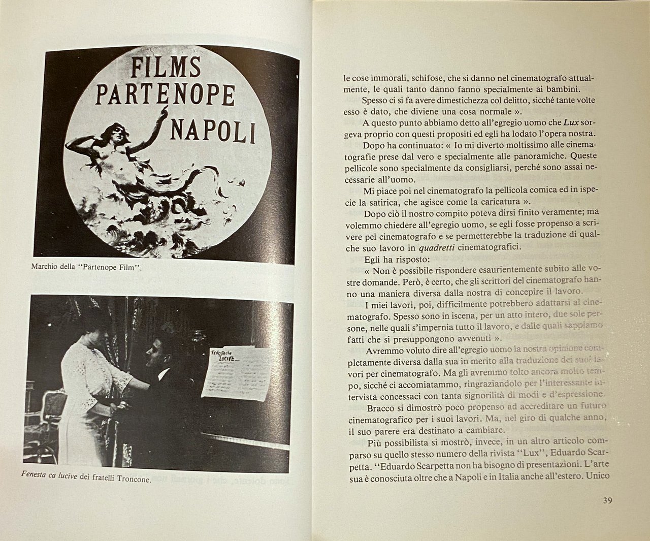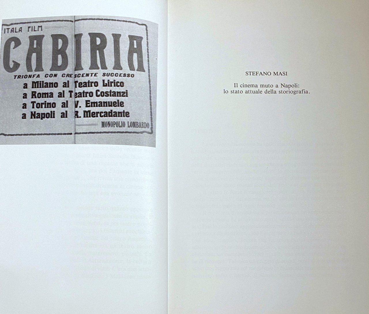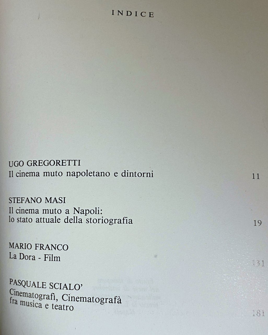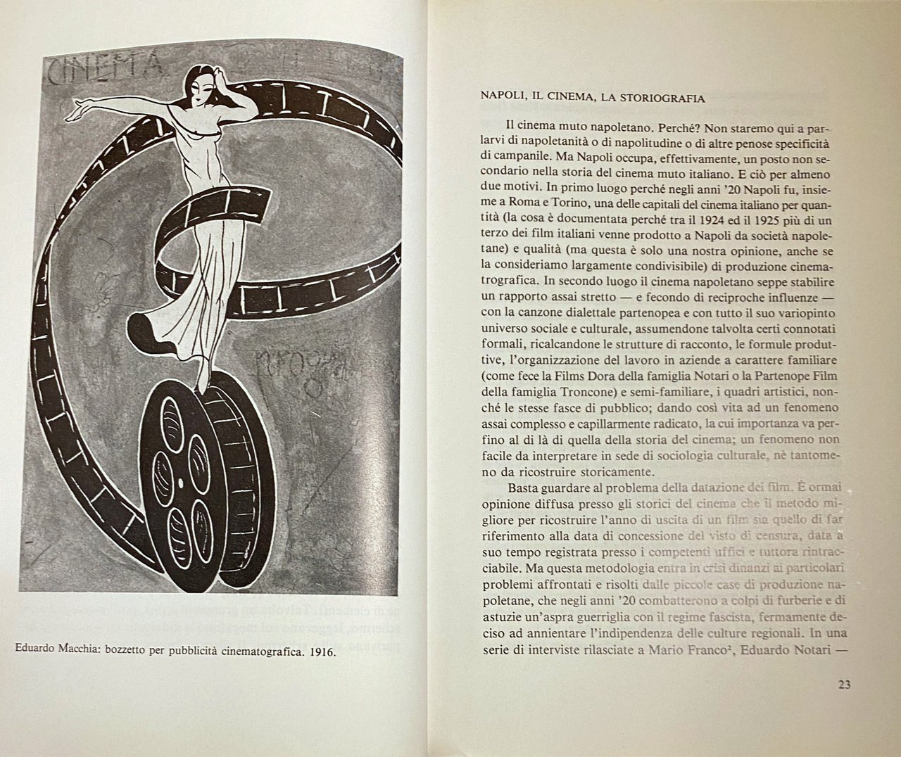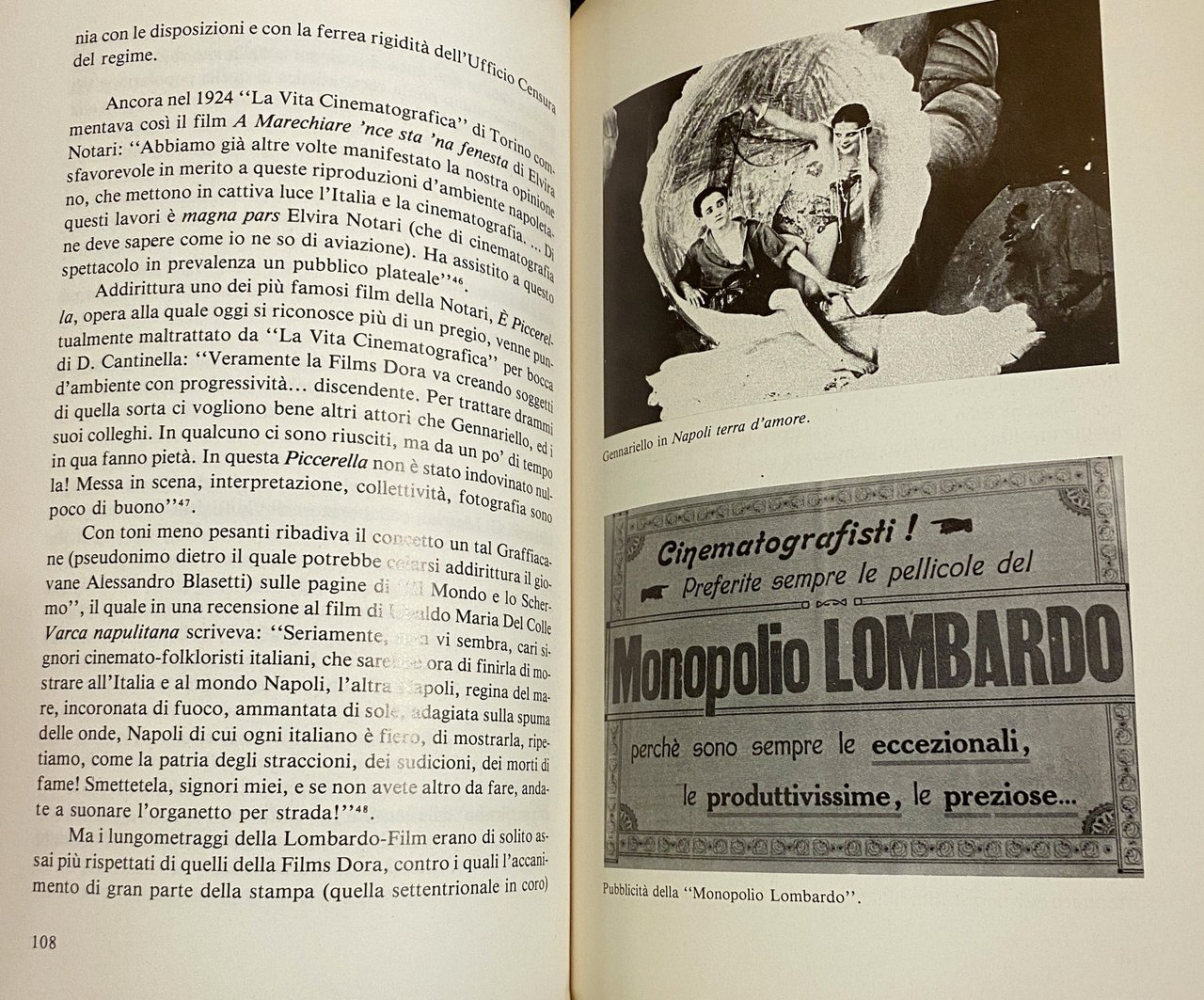 Soggetti: Cinema muto Cinematografia italiana, Spettacolo, Critica, Storia, Napoli, Storiografia, Iconografia, Cultura popolare, Attori, Attrici, Registi, Case di produzione, Filmografia, Musica Canzone napoletana, Libri illustrati Vintage fuori catalogo, Collezionismo Rarità Melodramma Divi Anni Venti, Anni Trenta, Fascismo Anni Quaranta, Anni Dieci Sceneggiata Recitazione Arte cinematografica Personaggi Bibliografia Riferimento Famiglie Bassi napoletani, Novecento Elvira Coda Notari Licio Esposito La cattura del pazzo di Bagnoli Kolossal Drammi Tragedie Gelosia Amore Cafè Chantant Locali Varietà Intrattenimento Tempo libero Divertimento Filmina Pellicola Arrivederci e Grazie Oleografia Partenope Film Fratelli Troncone Le mille e una notte Colore Dora Films Manifesti Cartelloni pubblicitari Locandine Pubblico Spettatori Donne Mercato Emigrati America Stereotipi Mimo Mimica Gestualità Gennariello Film 'A legge Crimini Miseria Nobiltà Censura Lettura preventiva Copione Didascalie Italiano Dialetto Carcere Libero Bovio Sotto san Francesco Fantasia 'e Surdate Sala Grandi successi Sonoro Guerra Filmati Documenti Archivio Guagliò, ciak si gira! E piccerella e 'A santanotte Dive Immagine Merce Sfruttamento Repertorio Maschere Teatro Pionieri Produttori Declino Fine David Griffith Massa Industria Hollywood Montaggio Primi piani Campi lunghi Panoramiche Carrellate Sergej Ejzenstejn Scenografia Gloria Cabiria Lumière Capitale Universale Internazionale Innovazione tecnica Cinepresa Macchina Leda Gys Francesca Bertini Donna fatale Femme Gustavo Serena Ubaldo Del Colle Mario Bonnard Eugenio Perego Roberto Bracco Gabriele D'Annunzio Guido Da Verona Umberto Notari Assunta Spina Celio Cines Sensualità Capitalismo Star System Divismo Stati Uniti Consumo Commedia Modernità Tradizione Folklore Musicali Costumi Miramare Emanuele Rotondo Zappatore Lombardo Any Vincenzo Pergamo Fermento La leggenda del Piave E. A. Mario E.L. Murolo Salvatore Di Giacomo Recensioni Benedetto Croce Don Pietro Caruso Vicoli Cineteca Sperduti nel buio Francesco Mastriani Letteratura Carolina Invernizio Trame Matilde Serao Schermo Ruoli Finzione Rappresentazione Vesuvio Augusto Turchi Violenza Tradimenti Piedigrotta Pulcinella Maschere Borghesia Felice Sciosciammocca Mario Recanati Menotti Cattaneo Impresari Sala Iride Salone Margherita Camorra Incassi Monopolio Charles Krauss Ernesto Mazzetti Pietro Bianchi Vittorio Paliotti Edgar Morin Enzo Grano Genere Realismo Claudio Carabba Arpà Percy Allum Carosello Cinegiornale Imprenditori Galasso Brunetta Paisà Compagnie Vita quotidiana Narrativa Flâneur Vittorio Martinelli Visto Laura Mulvey Nanninella Walter Benjamin Lois Weber Edoardo Città Nano rosso Eva Nova Fenesta che lucive Recanati Sale cinematografiche Lucia Zanussi Proiezioni Amato Giuseppe Barattolo Italo Guglielmi Lire Posa Interpreti Scugnizzi Anton Menotti Buia Baraccone Beniamino Maggi Galleria Umberto Concerto Fotografia Memorie Giuseppe Sergi Canzonetta Nicola Maldacea Massimo Privitera La Divette Esibizione Yvette Guilbert Pasquale Iaccio Canzoniere Gina Annunziata Cinematografo Mario Franco Maria Rossetti Lucia Di Girolamo Giuliana Muscio Enrico Caruso Davide Montella My Cousin Canto lirico Eduardo Scarpetta Torino Maciste Febo Mari Mercadante Castellammare Macchia Pubblicità Santa Lucia Astra Ultimi giorni di Pompei S.I.G.L.A. Di Luggo Caflish Società Peppino Anapeta Aldo Bernardini Varca Marechiaro Carlo Riboulet Ettore De Mura Raffaele Viviani Vito Pandolfi Ferdinando Russo Guappi Fumo Festival Silent cinema Italian cinematography Entertainment Criticism History Naples Historiography Iconography Popular culture Actors Actresses Directors Production companies Filmography Music Neapolitan song Out of print illustrated books Collectibles Rarity Melodrama Stars 1920s 1930s Fascism 1940s 1910s Drama Acting Characters Bibliography Reference Families Twentieth century Dramas Tragedies Jealousy Love Clubs Variety Entertainment Free time Fun Thank You Oleography Nights Color Posters Billboards Posters Audience Spectators Women Market Emigrants Stereotypes Mime Mimicry Gestures Crimes Poverty Nobility Censorship Preliminary reading Script Captions Dialect Prison Fantasy Great successes Sound War Documents Archive Divas Image Merchandise Exploitation Repertoire Masks Theater Pioneers Producers Decline End Industry Editing Close-ups Long shots Panoramas Scenography Glory International Universal Capital Technical innovation Movie camera Machine Fatal woman Sensuality Capitalism Stardom United States Consumption Comedy Modernity Tradition Musical Costumes Reviews Alleys Lost in the darkness Literature Plots Screen Roles Fiction Representation Vesuvius Violence Betrayals Masks Bourgeoisie Entrepreneurs Takings Monopoly Genre Carousel Newsreel Entrepreneurs Companies Daily Life Fiction Seen City Theaters Screenings Posing Performers Sideshow Concert Photography Memoirs Songbook Cinematograph Opera Singing Turin Advertising Last Days Pompeii Smoke