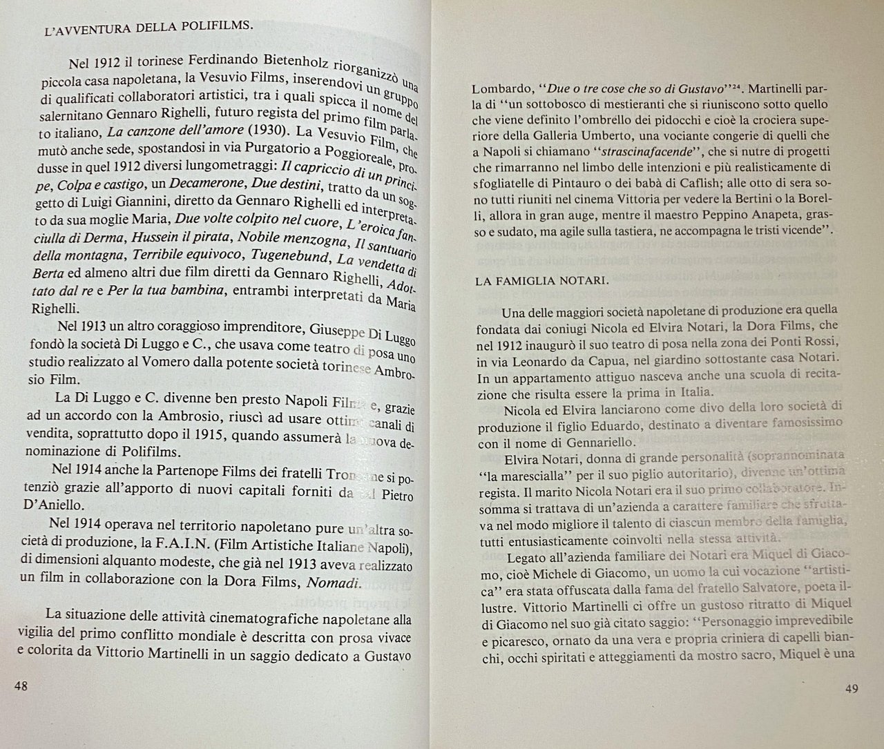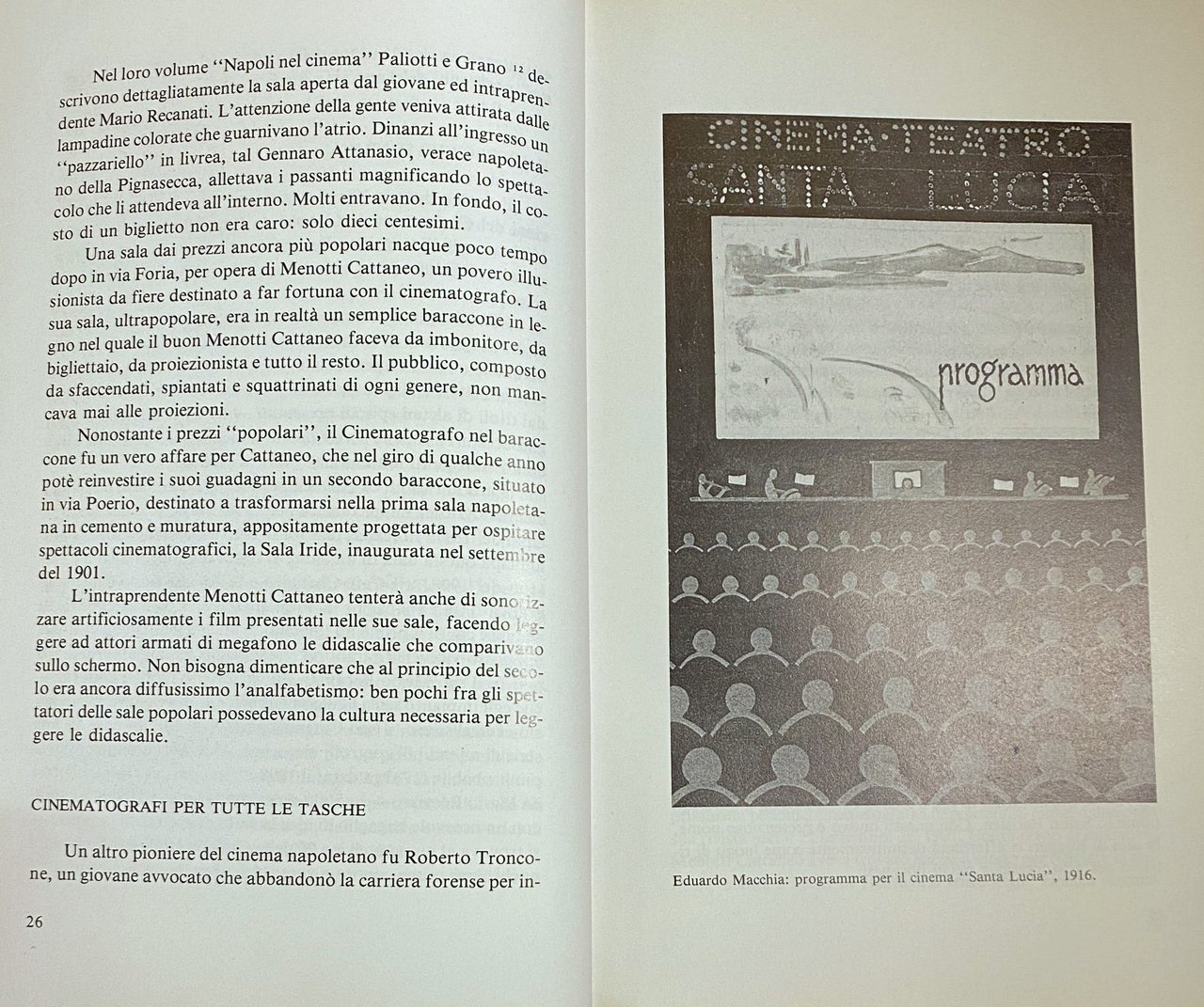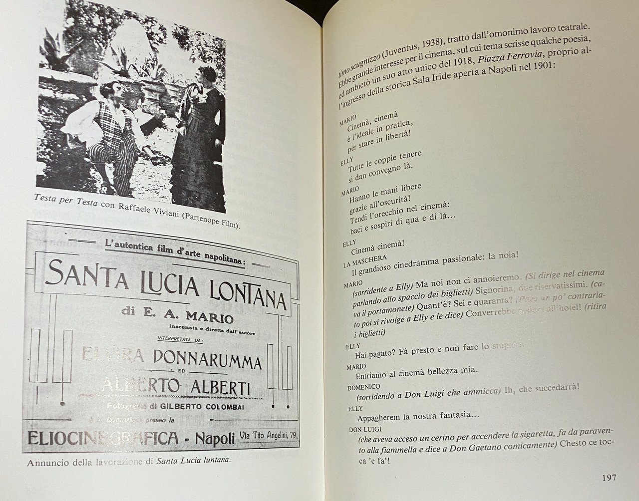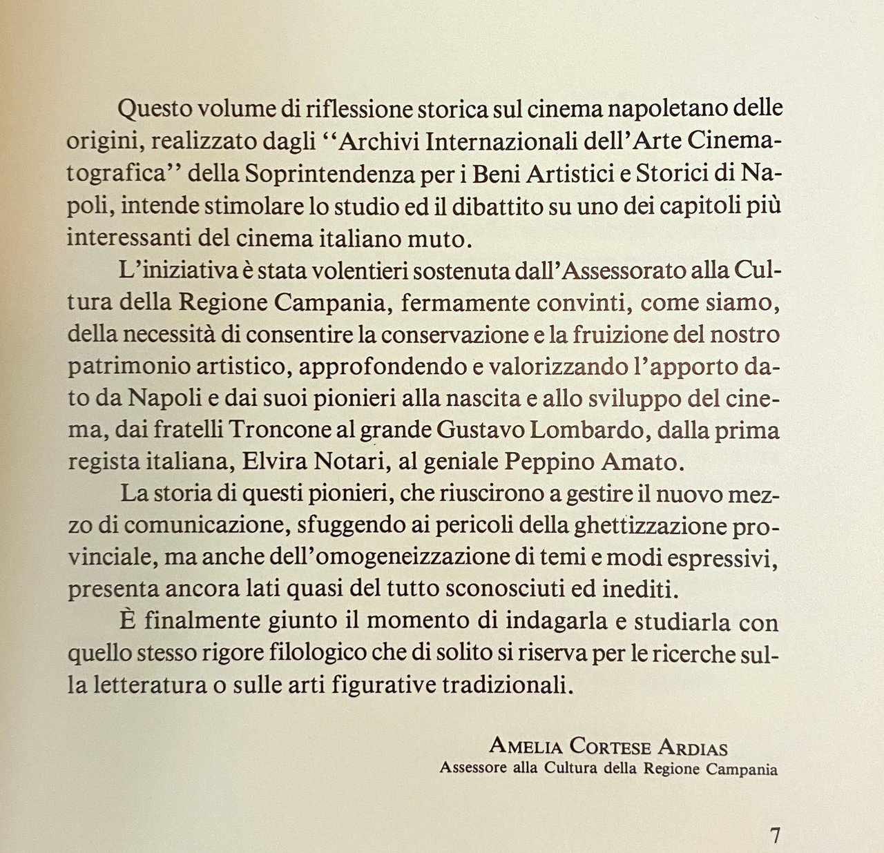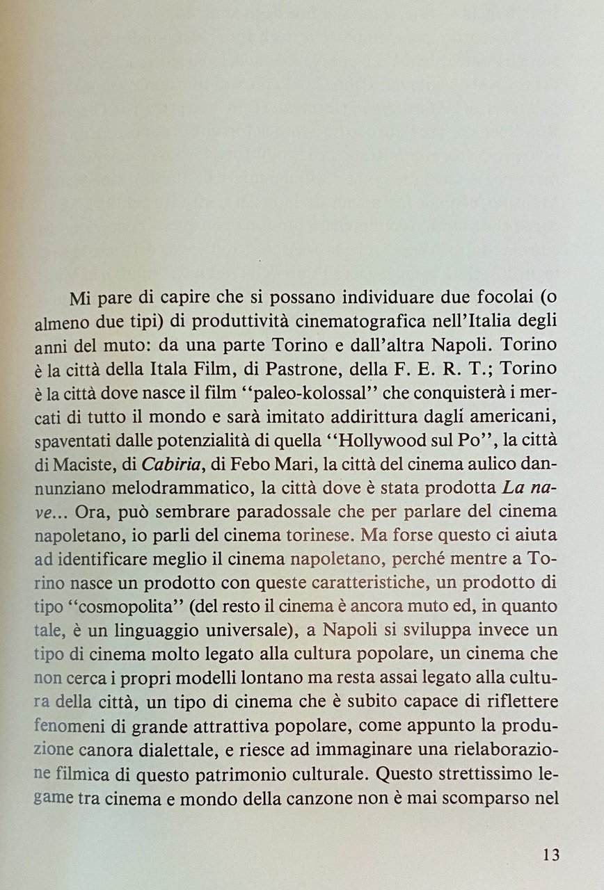 Soggetti: Cinema muto Cinematografia italiana, Spettacolo, Critica, Storia, Napoli, Storiografia, Iconografia, Cultura popolare, Attori, Attrici, Registi, Case di produzione, Filmografia, Musica Canzone napoletana, Libri illustrati Vintage fuori catalogo, Collezionismo Rarità Melodramma Divi Anni Venti, Anni Trenta, Fascismo Anni Quaranta, Anni Dieci Sceneggiata Recitazione Arte cinematografica Personaggi Bibliografia Riferimento Famiglie Bassi napoletani, Novecento Elvira Coda Notari Licio Esposito La cattura del pazzo di Bagnoli Kolossal Drammi Tragedie Gelosia Amore Cafè Chantant Locali Varietà Intrattenimento Tempo libero Divertimento Filmina Pellicola Arrivederci e Grazie Oleografia Partenope Film Fratelli Troncone Le mille e una notte Colore Dora Films Manifesti Cartelloni pubblicitari Locandine Pubblico Spettatori Donne Mercato Emigrati America Stereotipi Mimo Mimica Gestualità Gennariello Film 'A legge Crimini Miseria Nobiltà Censura Lettura preventiva Copione Didascalie Italiano Dialetto Carcere Libero Bovio Sotto san Francesco Fantasia 'e Surdate Sala Grandi successi Sonoro Guerra Filmati Documenti Archivio Guagliò, ciak si gira! E piccerella e 'A santanotte Dive Immagine Merce Sfruttamento Repertorio Maschere Teatro Pionieri Produttori Declino Fine David Griffith Massa Industria Hollywood Montaggio Primi piani Campi lunghi Panoramiche Carrellate Sergej Ejzenstejn Scenografia Gloria Cabiria Lumière Capitale Universale Internazionale Innovazione tecnica Cinepresa Macchina Leda Gys Francesca Bertini Donna fatale Femme Gustavo Serena Ubaldo Del Colle Mario Bonnard Eugenio Perego Roberto Bracco Gabriele D'Annunzio Guido Da Verona Umberto Notari Assunta Spina Celio Cines Sensualità Capitalismo Star System Divismo Stati Uniti Consumo Commedia Modernità Tradizione Folklore Musicali Costumi Miramare Emanuele Rotondo Zappatore Lombardo Any Vincenzo Pergamo Fermento La leggenda del Piave E. A. Mario E.L. Murolo Salvatore Di Giacomo Recensioni Benedetto Croce Don Pietro Caruso Vicoli Cineteca Sperduti nel buio Francesco Mastriani Letteratura Carolina Invernizio Trame Matilde Serao Schermo Ruoli Finzione Rappresentazione Vesuvio Augusto Turchi Violenza Tradimenti Piedigrotta Pulcinella Maschere Borghesia Felice Sciosciammocca Mario Recanati Menotti Cattaneo Impresari Sala Iride Salone Margherita Camorra Incassi Monopolio Charles Krauss Ernesto Mazzetti Pietro Bianchi Vittorio Paliotti Edgar Morin Enzo Grano Genere Realismo Claudio Carabba Arpà Percy Allum Carosello Cinegiornale Imprenditori Galasso Brunetta Paisà Compagnie Vita quotidiana Narrativa Flâneur Vittorio Martinelli Visto Laura Mulvey Nanninella Walter Benjamin Lois Weber Edoardo Città Nano rosso Eva Nova Fenesta che lucive Recanati Sale cinematografiche Lucia Zanussi Proiezioni Amato Giuseppe Barattolo Italo Guglielmi Lire Posa Interpreti Scugnizzi Anton Menotti Buia Baraccone Beniamino Maggi Galleria Umberto Concerto Fotografia Memorie Giuseppe Sergi Canzonetta Nicola Maldacea Massimo Privitera La Divette Esibizione Yvette Guilbert Pasquale Iaccio Canzoniere Gina Annunziata Cinematografo Mario Franco Maria Rossetti Lucia Di Girolamo Giuliana Muscio Enrico Caruso Davide Montella My Cousin Canto lirico Eduardo Scarpetta Torino Maciste Febo Mari Mercadante Castellammare Macchia Pubblicità Santa Lucia Astra Ultimi giorni di Pompei S.I.G.L.A. Di Luggo Caflish Società Peppino Anapeta Aldo Bernardini Varca Marechiaro Carlo Riboulet Ettore De Mura Raffaele Viviani Vito Pandolfi Ferdinando Russo Guappi Fumo Festival Silent cinema Italian cinematography Entertainment Criticism History Naples Historiography Iconography Popular culture Actors Actresses Directors Production companies Filmography Music Neapolitan song Out of print illustrated books Collectibles Rarity Melodrama Stars 1920s 1930s Fascism 1940s 1910s Drama Acting Characters Bibliography Reference Families Twentieth century Dramas Tragedies Jealousy Love Clubs Variety Entertainment Free time Fun Thank You Oleography Nights Color Posters Billboards Posters Audience Spectators Women Market Emigrants Stereotypes Mime Mimicry Gestures Crimes Poverty Nobility Censorship Preliminary reading Script Captions Dialect Prison Fantasy Great successes Sound War Documents Archive Divas Image Merchandise Exploitation Repertoire Masks Theater Pioneers Producers Decline End Industry Editing Close-ups Long shots Panoramas Scenography Glory International Universal Capital Technical innovation Movie camera Machine Fatal woman Sensuality Capitalism Stardom United States Consumption Comedy Modernity Tradition Musical Costumes Reviews Alleys Lost in the darkness Literature Plots Screen Roles Fiction Representation Vesuvius Violence Betrayals Masks Bourgeoisie Entrepreneurs Takings Monopoly Genre Carousel Newsreel Entrepreneurs Companies Daily Life Fiction Seen City Theaters Screenings Posing Performers Sideshow Concert Photography Memoirs Songbook Cinematograph Opera Singing Turin Advertising Last Days Pompeii Smoke