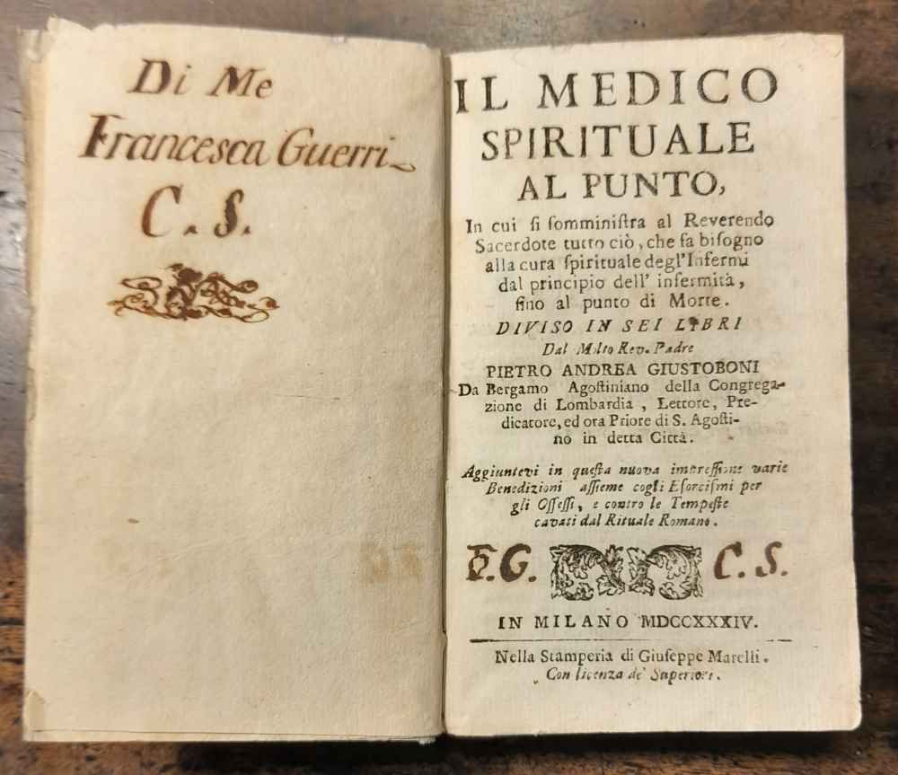 Il medico spirituale al punto, in cui si somministra al reverendo sacerdote . alla cura spirituale de gl'infermi . fino al punto di morte. Aggiuntevi in questa nuova impressione varie benedizioni cogli esorcismi per gli ossessi, e contro le tempeste. | Libri antichi e moderni | Giustoboni Pietro Andrea