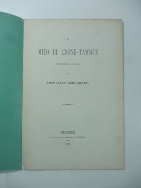 In 8 (cm 14,5 x 22), pp. 33 + (1b). Pagine intonse. Qualche brunitura alle pagine. Brossura muta coeva. Estratto dagli Atti del IV Congresso Internazionale degli Orientalisti (13 settembre 1878). Saggio sul mito di Tammuz, la divinita' mesopotamica il cui culto si diffuse in tutto l'oriente mediterraneo, inclusa la Grecia, dove prese il nome di Adone.
