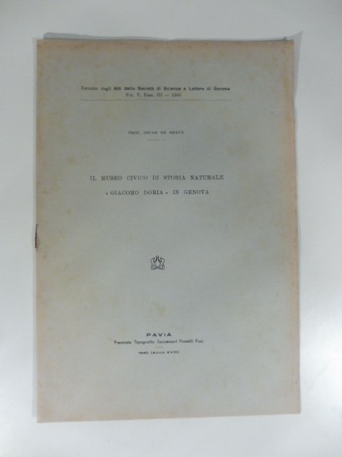 Il Museo civico di Storia naturale Giacomo Doria in Genova. Estratto editoriale | Libri antichi e moderni | De Beaux Oscar