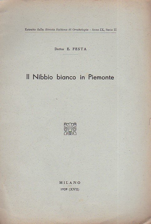 In-8°, pp. 4 nn., brossura editoriale. Una tav. fotografica f.t. raffigurante un nibbio bianco ucciso a Lombardore. Ottimo stato. Estratto dalla 'Rivista Italiana di Ornitologia', IX, serie II.