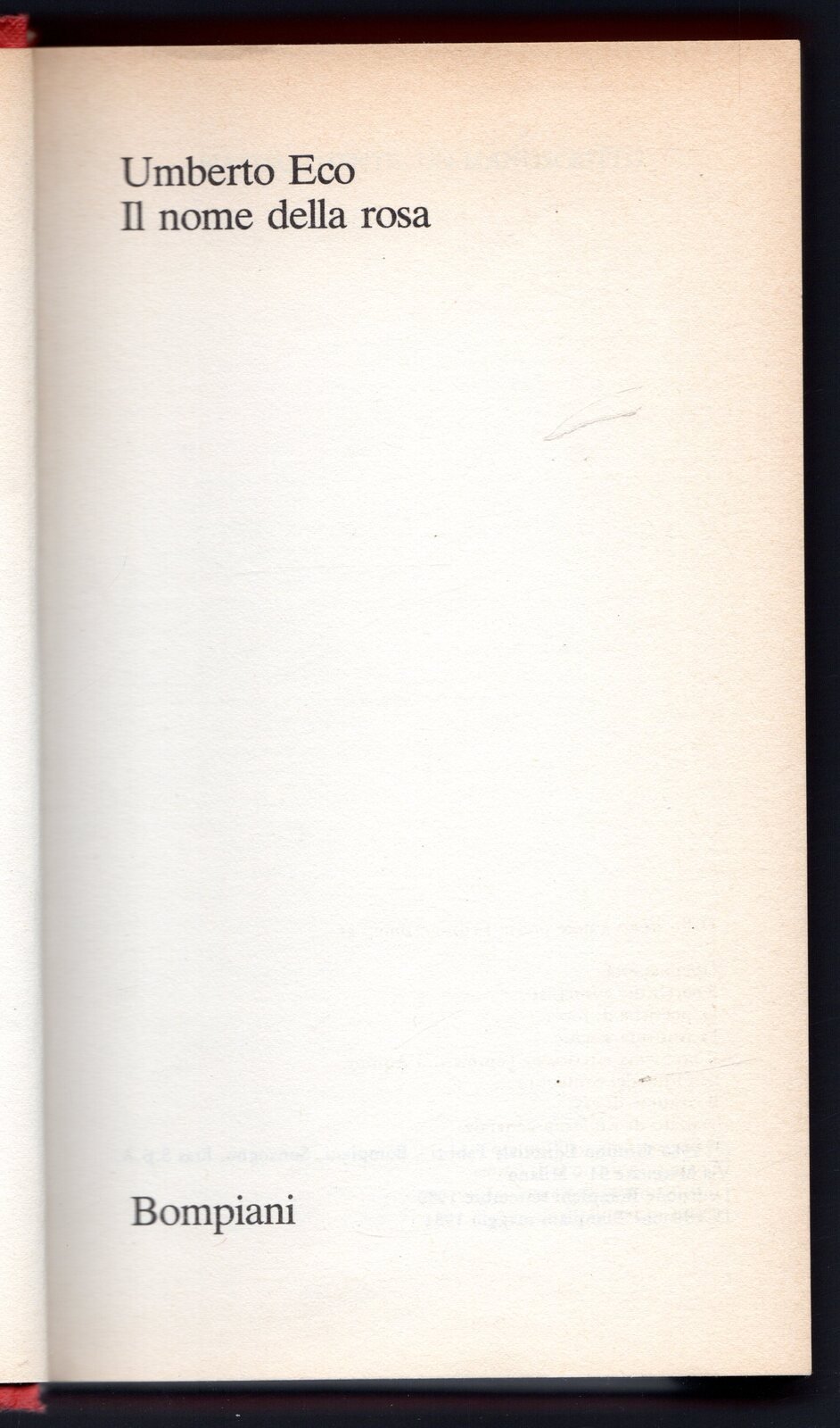 Libro vintage. Argomento: Narrativa. Autore: Eco Umberto. Editore: Bompiani. Luogo: Milano. Anno: 1981. Formato: in-8°. Pagg: 503. Legatura: Cartonata. Conservazione: discreta. Titolo impresso sul dorso, piatto muto. Piantina in nero sulle sguardie. Etichetta adesiva in ultima pagina. Difetto tra sguardia e corpo posteriori. Note a biro e sottolineature nell'indice.