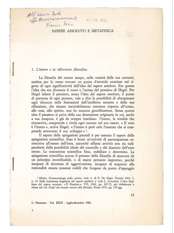 Il pensiero, vol. XXIII 1982: Sapere assoluto e metafisica. | Libri antichi e moderni | BOSIO, Franco