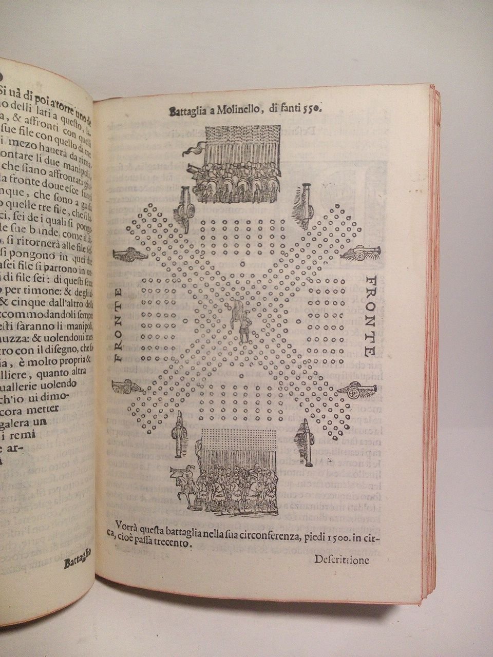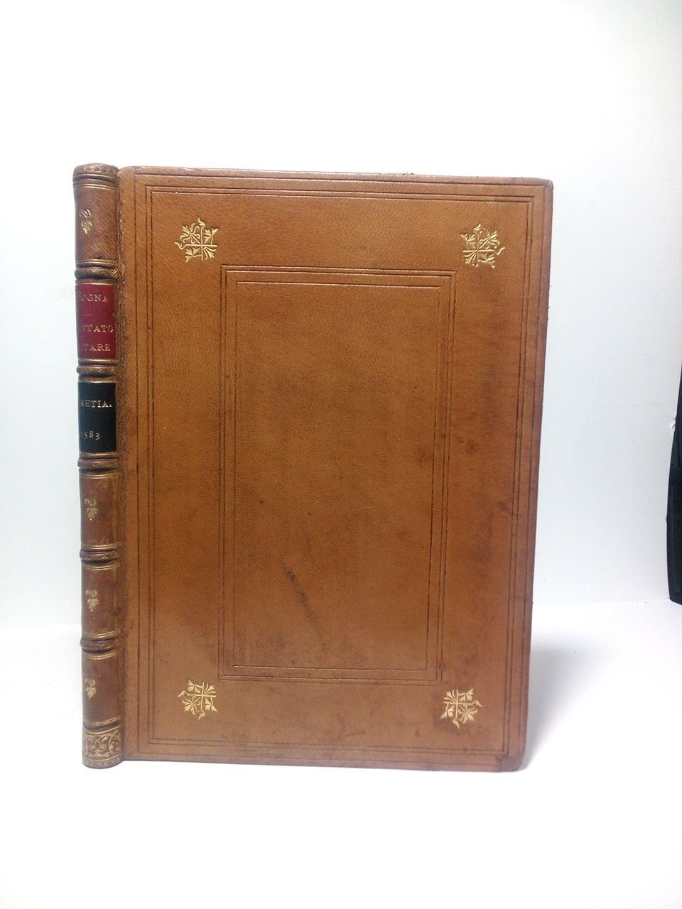 Con Privilegio, Gio. Matteo Camillo.- In Venetia: Apresso Camillo Castelli, M D LXXX III [1583].- [6 h.], 65 folios [i. e. 67], [1 h.]: Portada con un grabado xilográfico, bonitas letras capitales xilográficas, estados y diversos croquis con los cuadros y fomaciones militares; 4º menor (20,4 x 15 cm); Signaturas: *6, A-N4, Q6; Enc. en plena piel (de finales del siglo XIX o principios del XX), lomo con 2 tejuelos y cinco nervios, dorado, tapas con filetes paralelos en seco recuadrando y florones dorados en las esquinas, cortes tintados en color granate.* Por error tipográfico indica folio 65 al que debía ser nº 67. En la portada tiene estampado un bonito sello tampón de color rojo parcialmente tachado. También la portada está falta de un trozo de papel en su margen externo que no toca texto y ha sido restaurado. La esquina inferior externa de la tapa anterior con una pequeña falta de piel, que está restaurada. Por lo demás en excelente estado. EJÉRCITO Y TEMAS MILITARES