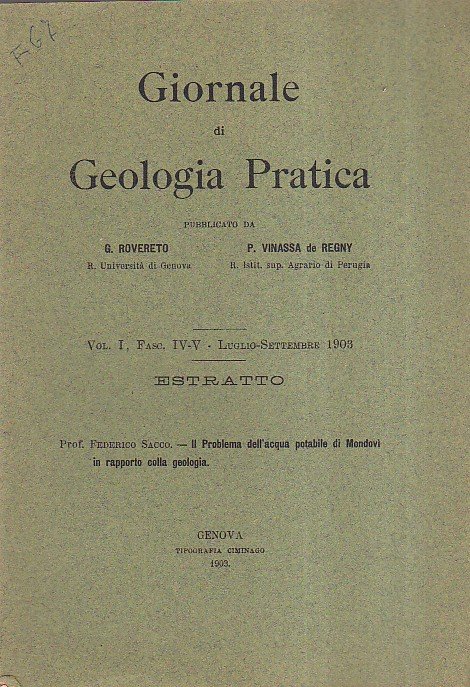 Il Problema dell'acqua potabile di Mondovì in rapporto colla geologia. Giornale di Geologia Pratica pubblicato da G. Rovereto e P. Vinassa de Regny. Vol. I, Fasc. IV - V - Luglio - Settembre 1903 | Libri antichi e moderni | Sacco Federico