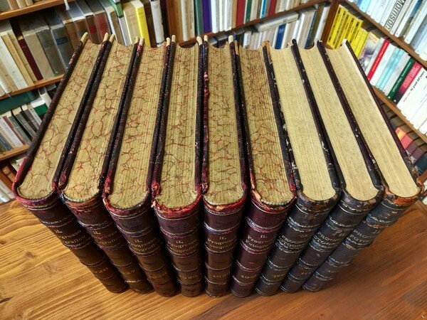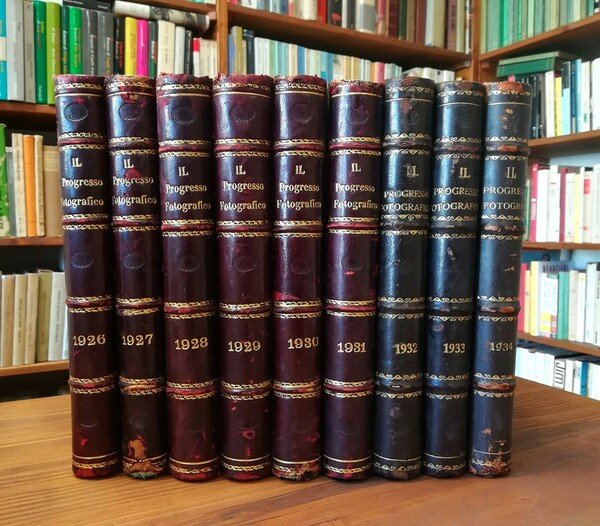 Annate complete dal 1926 al 1934 della storica rivista di fotografia, rilegate in otto tomi con belle legature in mezza pelle, piatti decorati a secco e tagli marmorizzati nei primi cinque volumi; pagine a numerazione continua per ciascuna annata, rispettivamente 384, 404, 432, 432, 432, 432, 428, 388, 388, numerosissime illustrazioni e tavole, sia in nero che a colori. Le legature risultano fragili alle cerniere a motivo della scarsa manutenzione, sono stati effettuati restauri e lucidature per quanto possibile; gli interni sono invece perfettamente conservati. Esemplari da collezione. SPEDIZIONE IN 24 ORE DALLA CONFERMA DELL'ORDINE.