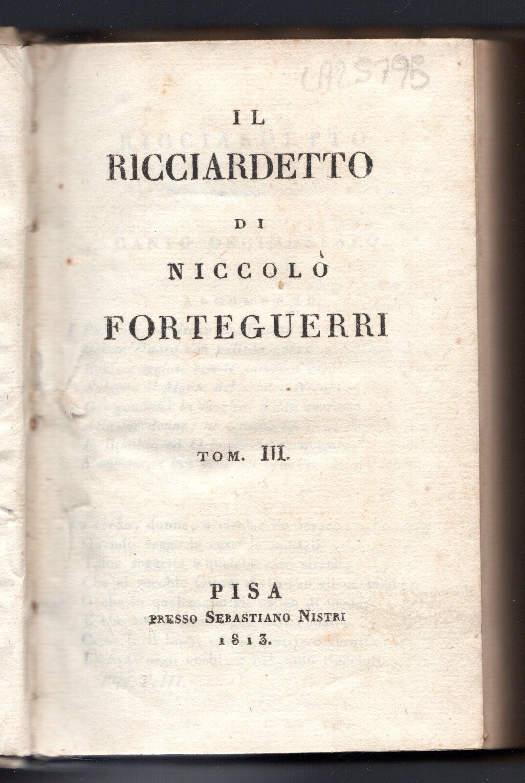 Il Ricciardetto di Niccolò Forteguerri. Tomo III | Libri antichi e moderni | Forteguerri Niccolò, Forteguerri Niccolò