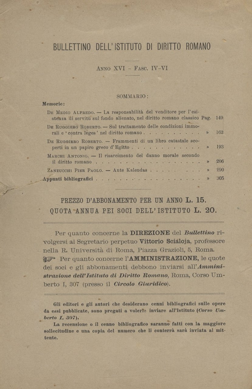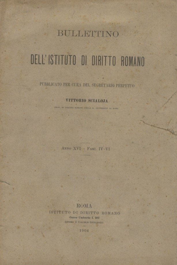 Roma, Istituto di Diritto Romano, 1904, in-8, brossura editoriale, pp. numerate da 149 a 309. Dal sommario del fascicolo segnaliamo anche "La responsabilità del venditore per l'esistenza di servitù sul fondo alienato, nel diritto romano classico" di Alfredo De Medio, "Sul trattamento delle condizioni immorali e 'contra leges' nel diritto romano" e "Frammenti di un libro catastale scoperti in un papiro greco d'Egitto" di Roberto De Ruggiero e "Ante Kalendas" di Pier Paolo Zanzucchi.