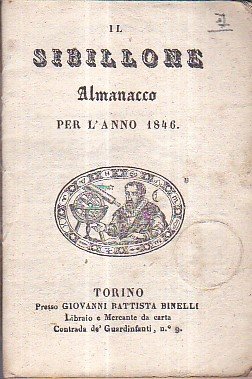 In-24°, pp. 79, brossura originale decorata a colori. Vignetta xilografica al titolo. Annotazioni di mano coeva al risguardo posteriore. Buon esemplare. Probabile unica annata pubblicata. Assai raro e sconosciuto a SBN / ICCU, che registra solo un omonimo almanacco 'Il Sibillone' pubblicato ad Asti dal 1812 al 1822. Contiene il calendario per il 1846, cenni su Casa Savoia, sulla pubblica amministrazione del Regno di Sardegna e dodici 'conferenze' in cui si disquisisce in forma dialogica degli argomenti più curiosi.