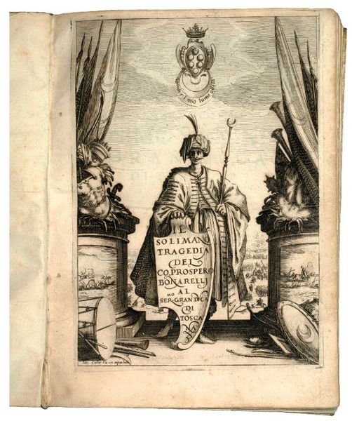 4to. Illustrated, engraved title by Jacques Callot, (10), 162, (2) pp. With 5 folding, etched plates by Callot and woodcut printer’s device. Contemporary limp vellum. Wants ties. First edition. The magnificent engravings count among the most beautiful of Callot’s theatre and ballet illustrations. "The play [about the murder of young Mustapha by his father, the Turkish Sultan Soliman II (1596–1666)], which is dedicated to Cosimo II, Grand Duke of Tuscany, was a great success as a book; by 1636 it had gone through six editions […] The artistic significance of this work lies especially in its swift dramatic action, the well-differentiated characterisations, the skilful metre, and last but not least in its lyrical passages […]" (cf. KNLL II, 892). "Tragedia in cinque atti, una delle più importanti ed interessanti del secolo XVII, assai ricercata per la bella veste tipografica" (Libr. Vinciana). - Some foxing and browning in the blank margins; spine imperceptibly restored. - Cicognara 1086. Gamba 1536. Kat. d. Ornamentstichslg. Berlin 4112. Libreria Vinciana 3870. Slg. Schäfer, Sotheby's Cat. 8/XII/1994, lot 38 (USD 6000). Lieure 363-368. Brunet I, 1089. Graesse I, 483. Ebert 2725.