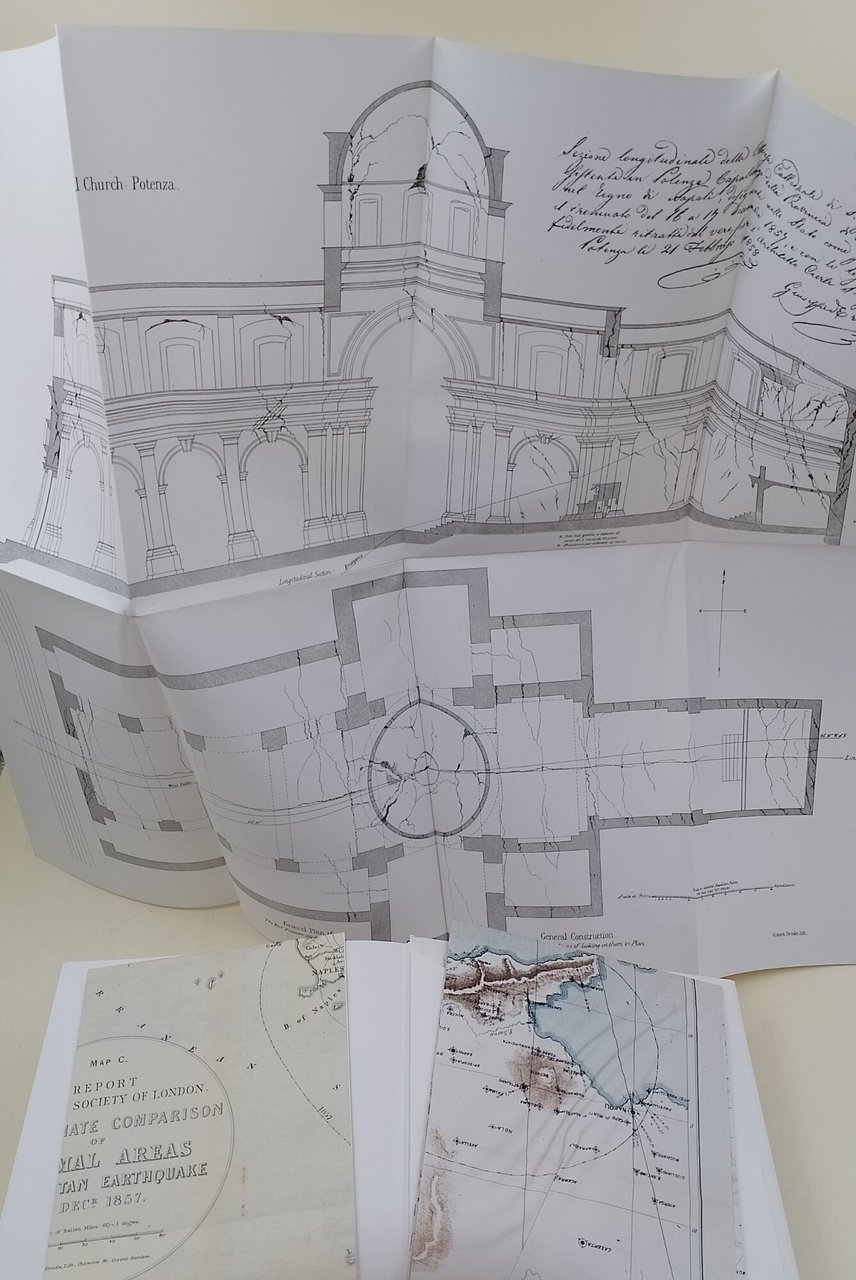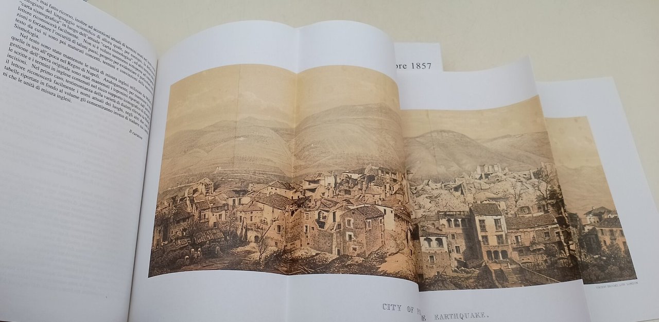 I vol.: Primi principi di Sismologia Osservazionale-Rapporto alla Royal Society di Londra( della spedizione condotta per donto della Societa' all'interno del Regno di Napoli per studiare le circostanze del grande terremoto del dicembre 1857, Mallet, R., traduzione integrale dell'opera originale edita a Londra nel 1862, pp. 517, con 92 tavole f.t. di cui 8 di grande formato.