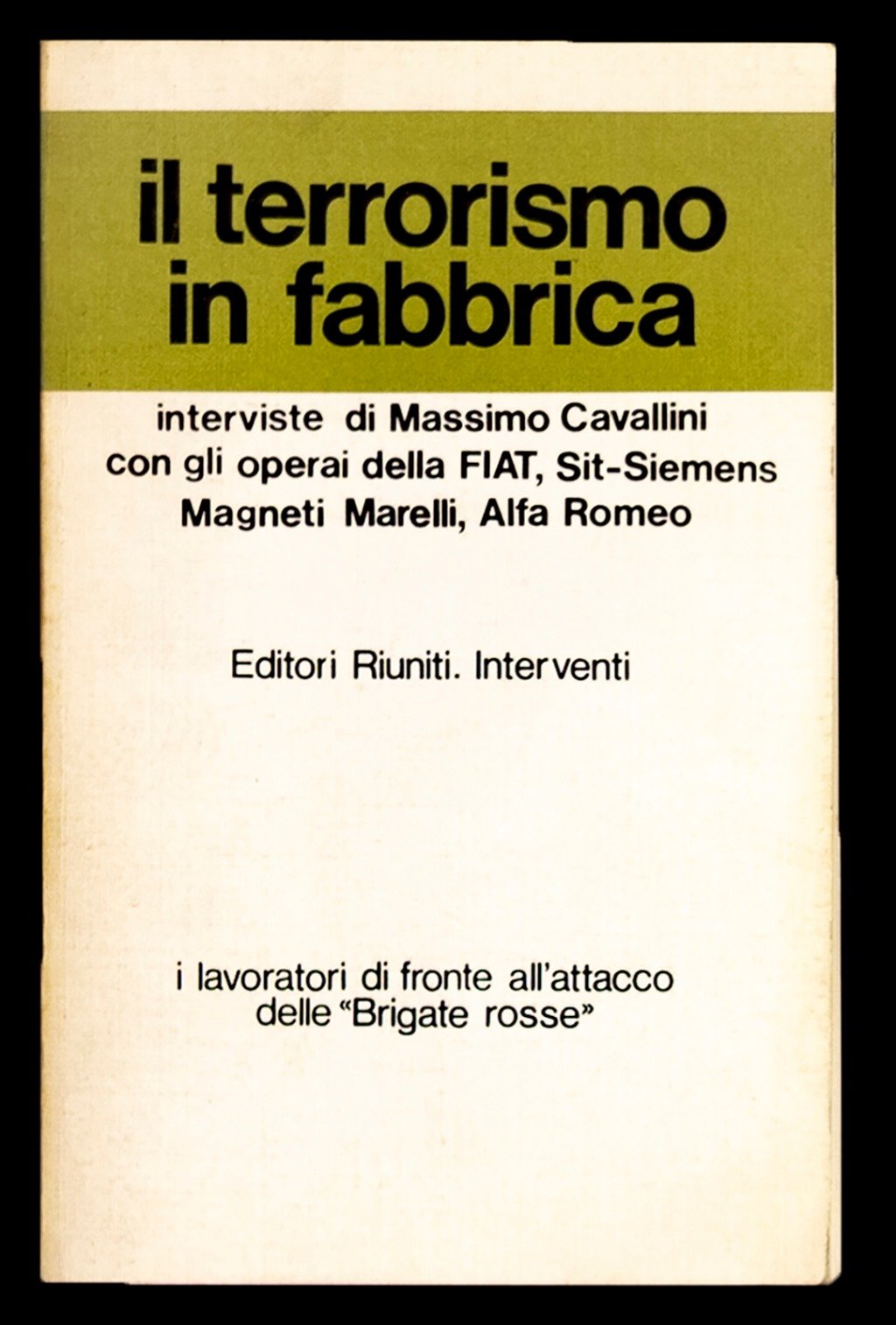 Collana "Interventi" 12. Interviste di Massimo Cavallini con gli operai della FIAT, Sit-Siemens Magneti Marelli, Alfa Romeo. Timbro al retro della copertina, leggerissimo segno del tempo