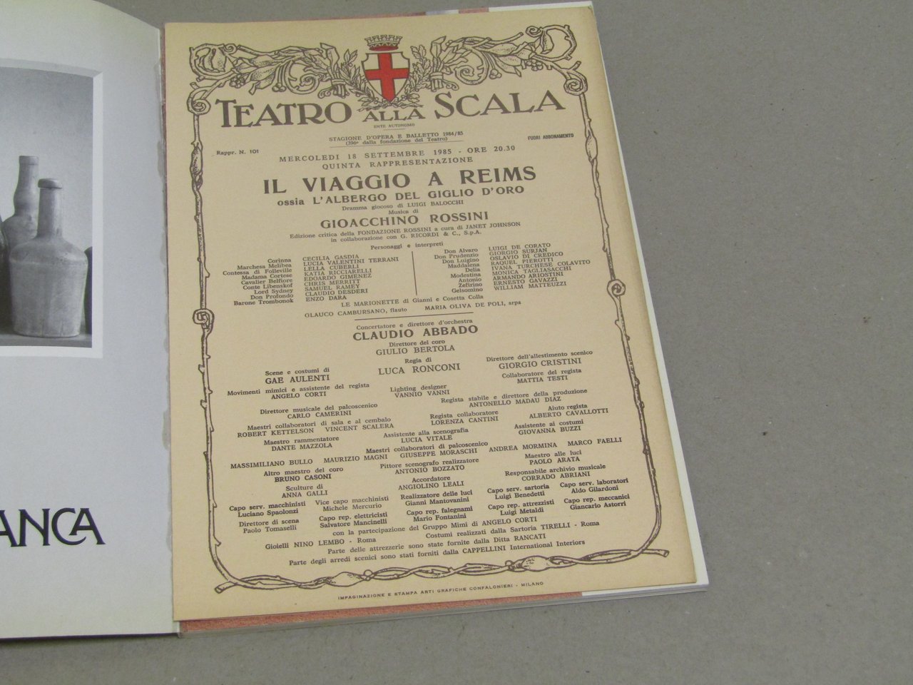 AA. VV. Il viaggio a Reims di Gioacchino Rossini. Milano, Teatro alla Scala 1985 - I italiano, in ottavo pp.84 Libretto per l'opera lirica "Il viaggio a Reims". Copertina e pagine lievemente ingiallite ai bordi.