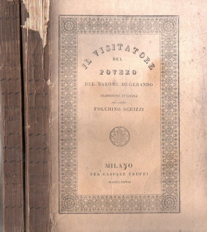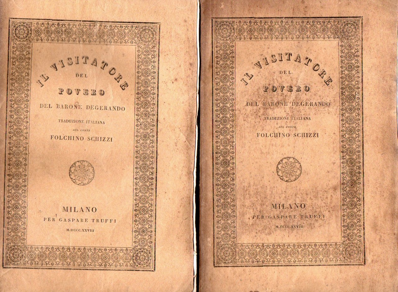 Il visitatore del povero del Barone Degerando membro dell'istituto di Francia. Opera premiata dall'Accademia di Lione nel 1821 .Seconda edizione milanese della prima traduzione italiana sulla terza edizione francese riveduta ed aumentata Premessi alcuni cenni sullo stato della pubblica beneficienza nel Regno Lombardo Veneto riveduti ed aumentati in questa seconda edizione del Conte Folchino Schizzi. (2 vol.)