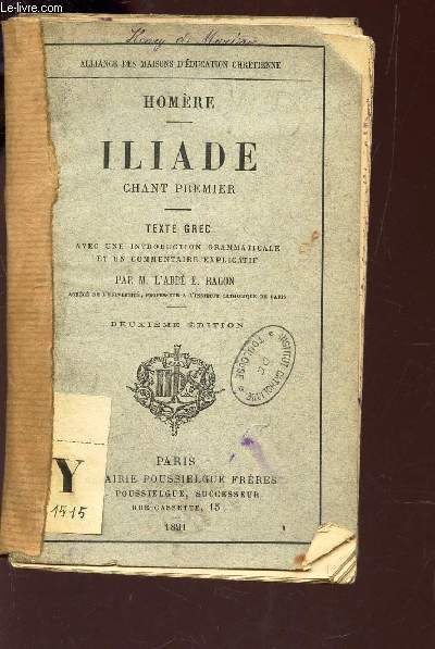 ILIADE - CHANT PREMIER - TEXTE GREC / ALLIANCE DES MAISONS D'EDUCATION CHRETIENNE / 2e EDITION. | Libri antichi e moderni | Homere (Par Ragon E. Abbe)