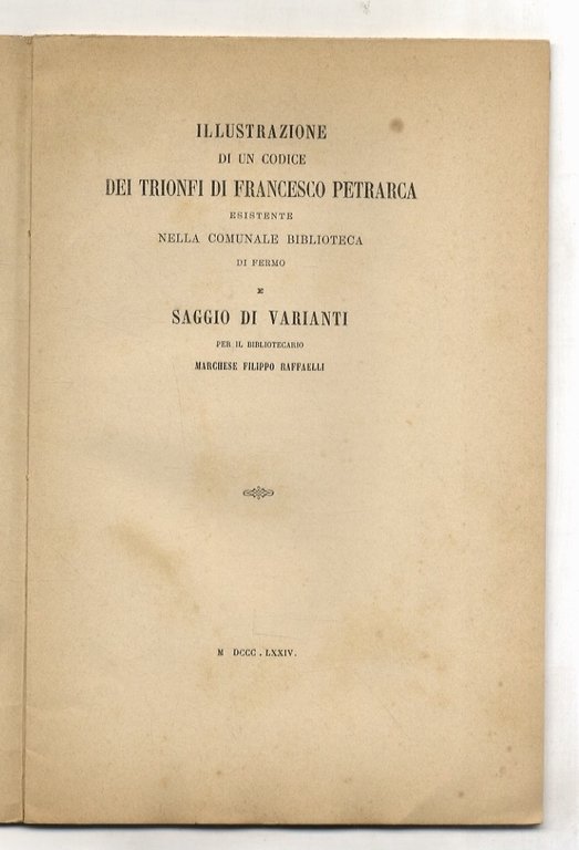 Illustrazione di un codice dei Trionfi di Francesco Petrarca essitente nella Comunale Biblioteca di Fermo e saggio di varianti, per il bibliotecario marchese Filippo Raffaelli. | Libri antichi e moderni | Raffaelli Filippo.