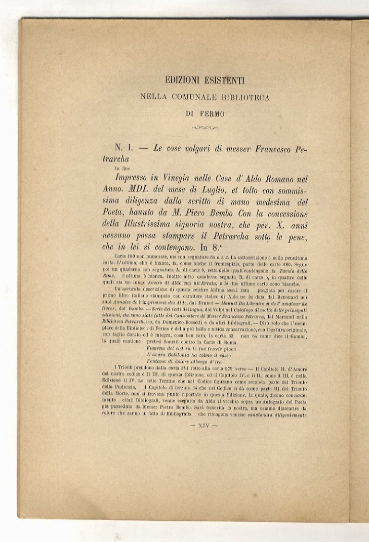 Fermo, Tipografia degli Eredi Paccasassi, 1874, in-8 grande, br. editoriale, pp. [2], XXXXVI, [2]. Ottime condizioni.