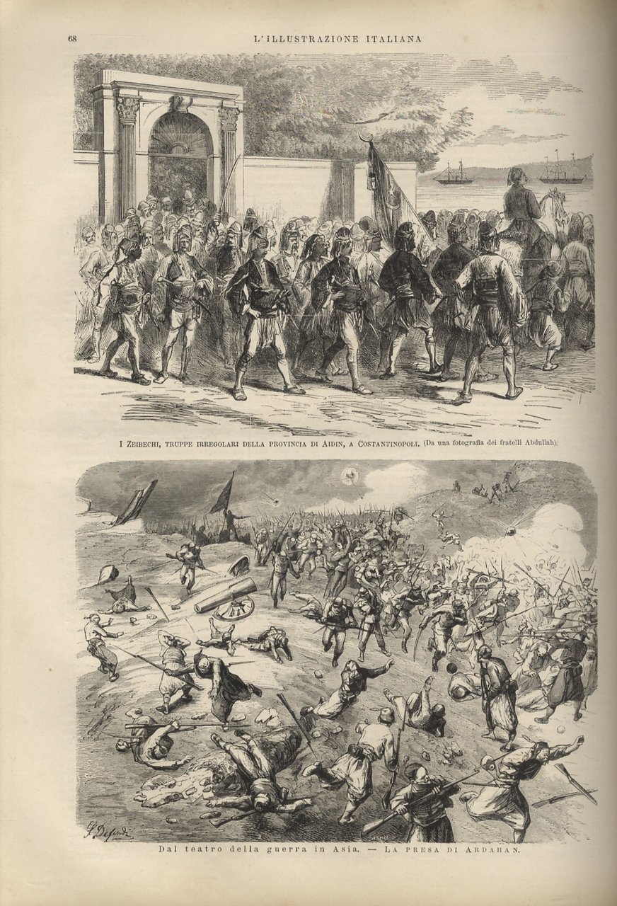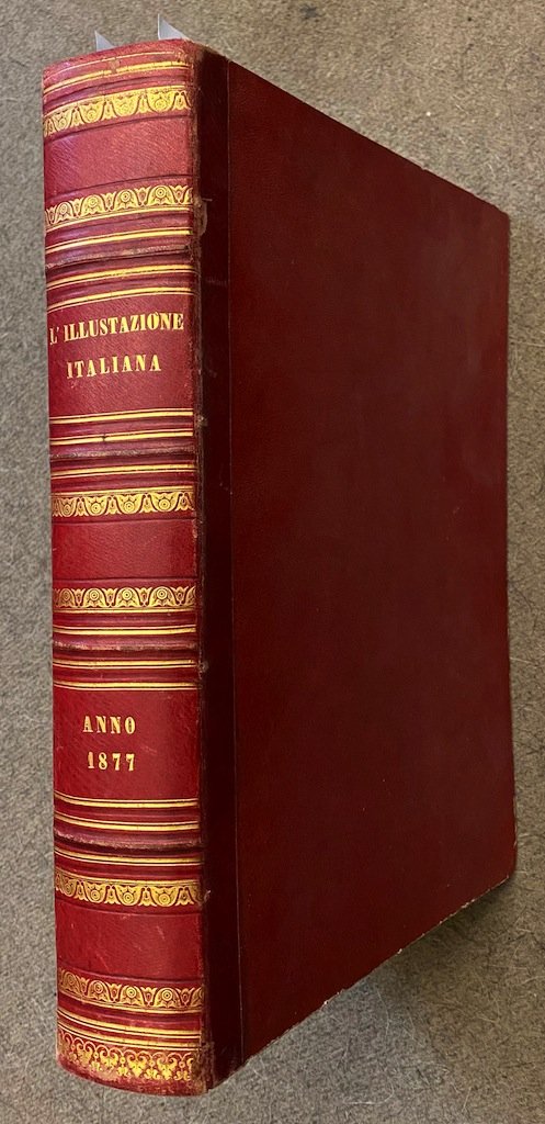 Milano, Fratelli Treves, 1877, due semestri legati in 1 volume, in-folio, bella legatura coeva in mezza pelle rossa, dorso a 4 nervi con titolo, numero dell'annata, filetti e fregi in oro, pp. 403, [1] - 412. Con centinaia di illustrazioni xilografiche (segnaliamo una bella veduta a doppia pagina di Costantinopoli) comprese nella paginazione. Mancano il frontespizio generale del primo semestre, l'indice generale del secondo e l'ultimo fascicolo, il n. 52 del 30 dicembre 1877. Le pagine 401-403 del primo semestre, recanti l'indice generale del primo semestre, sono legate in posizione errata. Al fascicolo n. 26 (il primo del secondo semestre) potrebbero mancare (salvo un errore nella paginazione) le pp. 3-4 e 13-14. Volume in bella legatura e in ottime condizioni generali di conservazione.