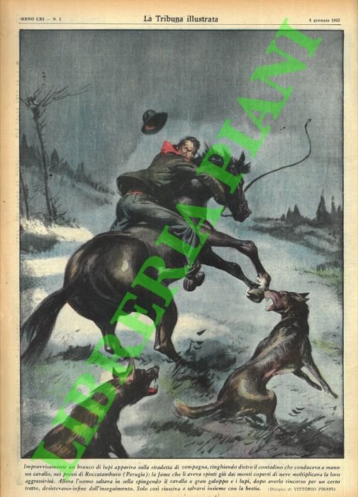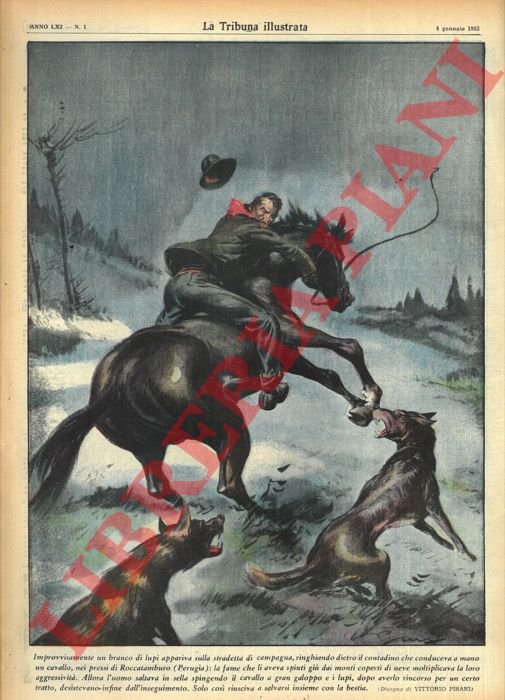 Improvvisamente un branco di lupi appariva sulla stradetta di campagna, ringhiando dietro il contadino che conduceva a mano un cavallo, nei pressi di Roccatamburo (Perugia) : la fame che li aveva spinti giù dai monti coperti di neve moltiplicava la loro aggressività. . | Libri antichi e moderni | Pisani Vittorio