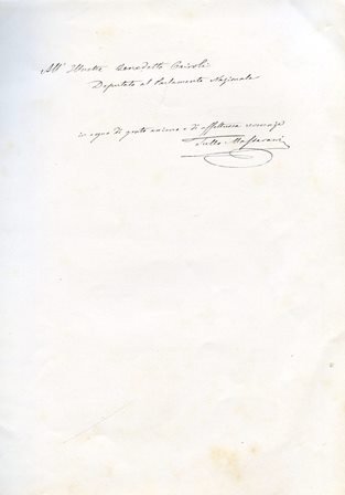 In-4°, pp. 15, brossura editoriale grigia. Ottimo stato. Dedica autografa del Massarani a Benedetto Cairoli: 'All'Illustre Benedetto Cairoli Deputato al Parlamento Nazionale in segno di grato animo e di affettuosa reverenza Tullio Massarani'. Edizione originale di questo lungo componimento poetico. Il Massarani (Mantova, 1826-Milano, 1905) fu fecondo poligrafo, artista (fu pittore di buona mano, allievo in gioventù di Domenico Induno) e patriota. Esule dal 1848 al 1850 per aver preso parte alle cospirazioni antiaustriache del Risorgimento lombardo, collaborò al 'Crepuscolo' di Carlo Tenca, facendosi sulle sue colonne primo divulgatore italiano delle opere di Heine. Deputato al Parlamento per tre legislature, senatore dal 1876, nel 1878 venne nominato (congiuntamente dal governo francese e da quello italiano) Presidente della giuria dell'Esposizione artistica di Parigi. La sua ingente bibliografia spazia nei più vari campi, dalla pubblicistica alla critica letteraria, dall'arte alla storia, etc. Sul Massarani, Croce, Letteratura della nuova Italia, V, passim.