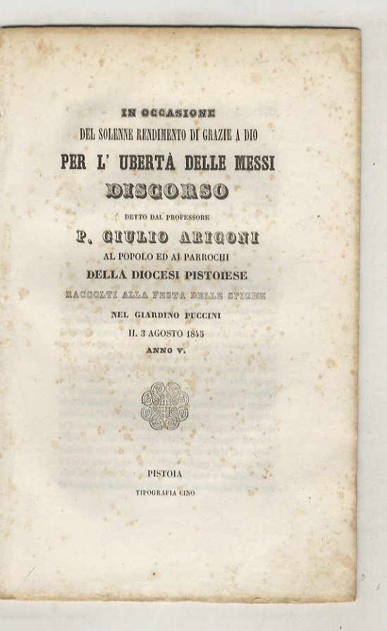 In occasione del solenne rendimento di grazie a Dio per l'ubertà delle messi. Discorso detto [.] al popolo ed ai parochi della diocesi pistoiese raccolti alla festa delle spighe nel giardino Puccini il 3 agosto 1845 anno V. | Libri antichi e moderni | Arigoni Giulio.