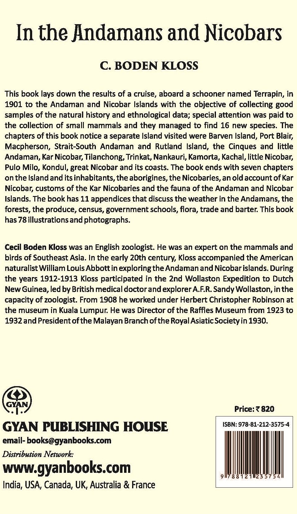 About the Book:- This book lays down the results of a cruise, aboard a schooner named Terrapin, in 1901 to the Andaman and Nicobar Islands with the objective of collecting good samples of the natural history and ethnological data; special attention was paid to the collection of small mammals and they managed to find 16 new species. The chapters of this book notice a separate Island visited were Barven Island, Port Blair, Macpherson, Strait-South Andaman and Rutland Island, the Cinques and little Andaman, Kar Nicobar, Tilanchong, Trinkat, Nankauri, Kamorta, Kachal, little Nicobar, Pulo Milo, Kondul, great Nicobar and its coasts. The book ends with seven chapters on the Island and its inhabitants, the aborigines, the Nicobaries, an old account of Kar Nicobar, customs of the Kar Nicobaries and the fauna of the Andaman and Nicobar Islands. The book has 11 appendices that discuss the weather in the Andamans, the forests, the produce, census, government schools, flora, trade and barter. This book has 78 illustrations and photographs.