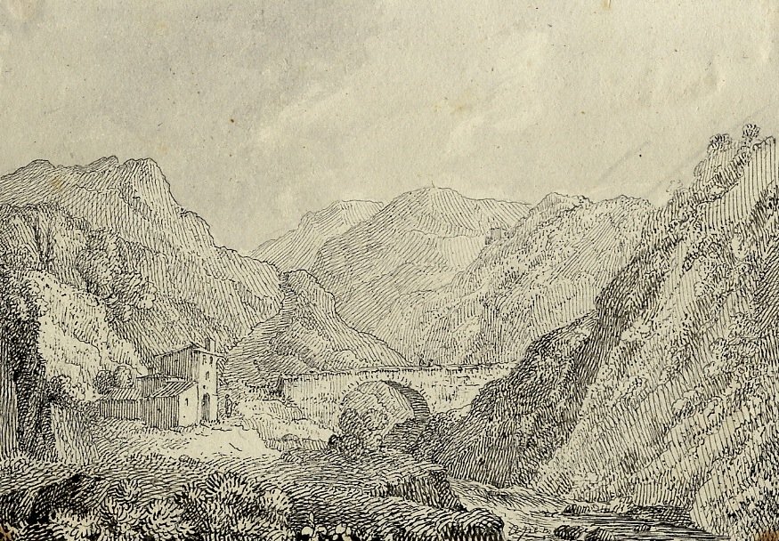 Bel disegno su carta, databile verso la prima metà dell'ottocento, mm. 235x165. Raffigura lo scorcio d'una valle appenninica con un casolare nei pressi d'un ponte su un fiume: probabilmente, rifacendosi a un altro disegno in nostro possesso, della stessa mano con luogo identificato, si tratta del Mugello. Applicato su foglio di supporto in carta grigia che reca il titolo manoscritto (incollatura solo ai 4 angoli). L'autore, che non si firma, è probabilmente un inglese: la provenienza e la mano sono le stesse del disegno da noi descritto alla scheda LD 124.259. Opera di buon livello.